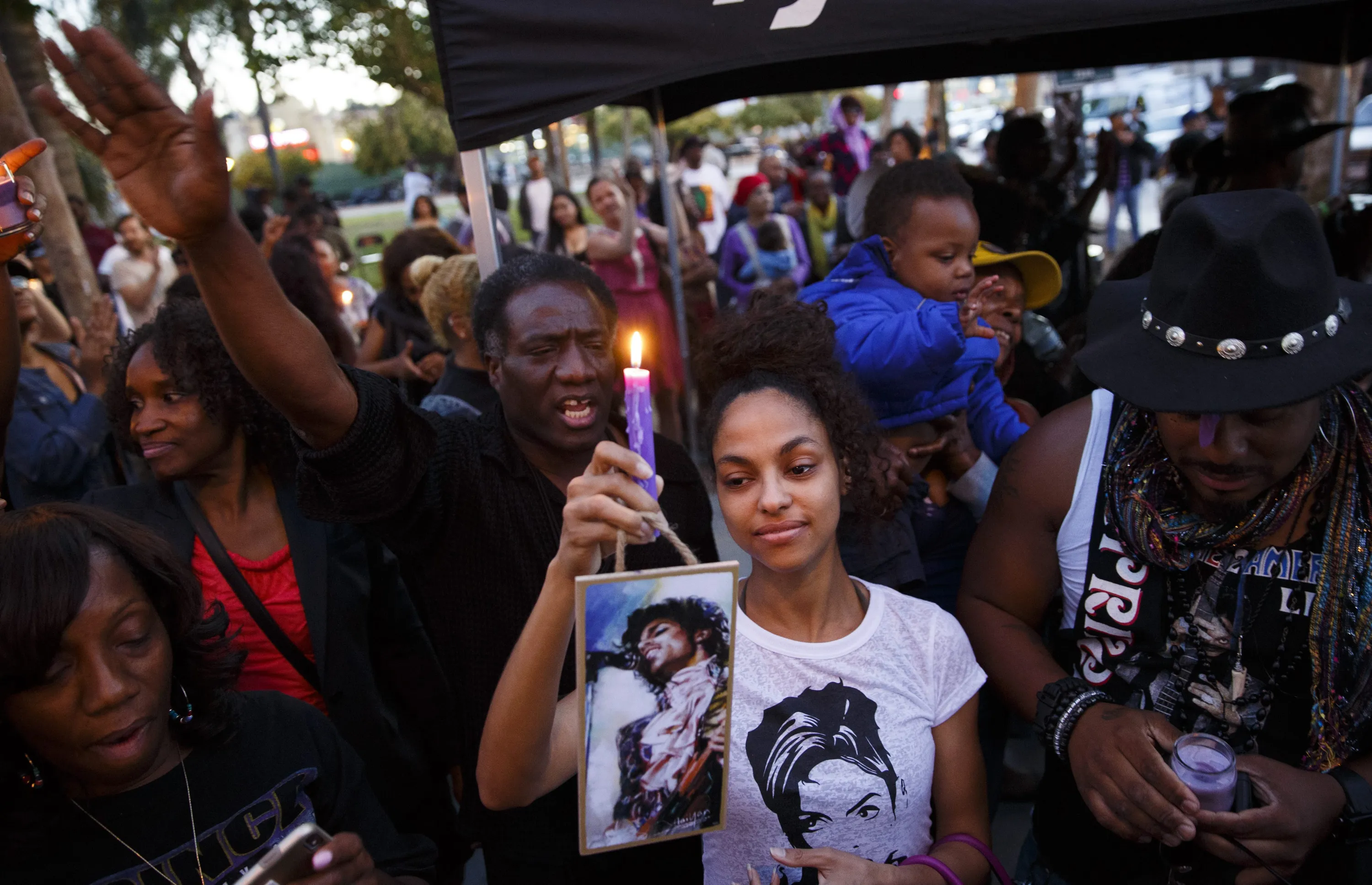 Mourners pay tribute to musician Prince during a vigil in Los Angeles, California, 21 April 2016. American singer-songwriter and musician Prince, a multi-talented artist who produced a string of genre-fusing hits in the 1980s, died on 21 April at his residence in Chanhassen, Minnesota. He was 57. (Photo by Eugene Garcia/EPA)