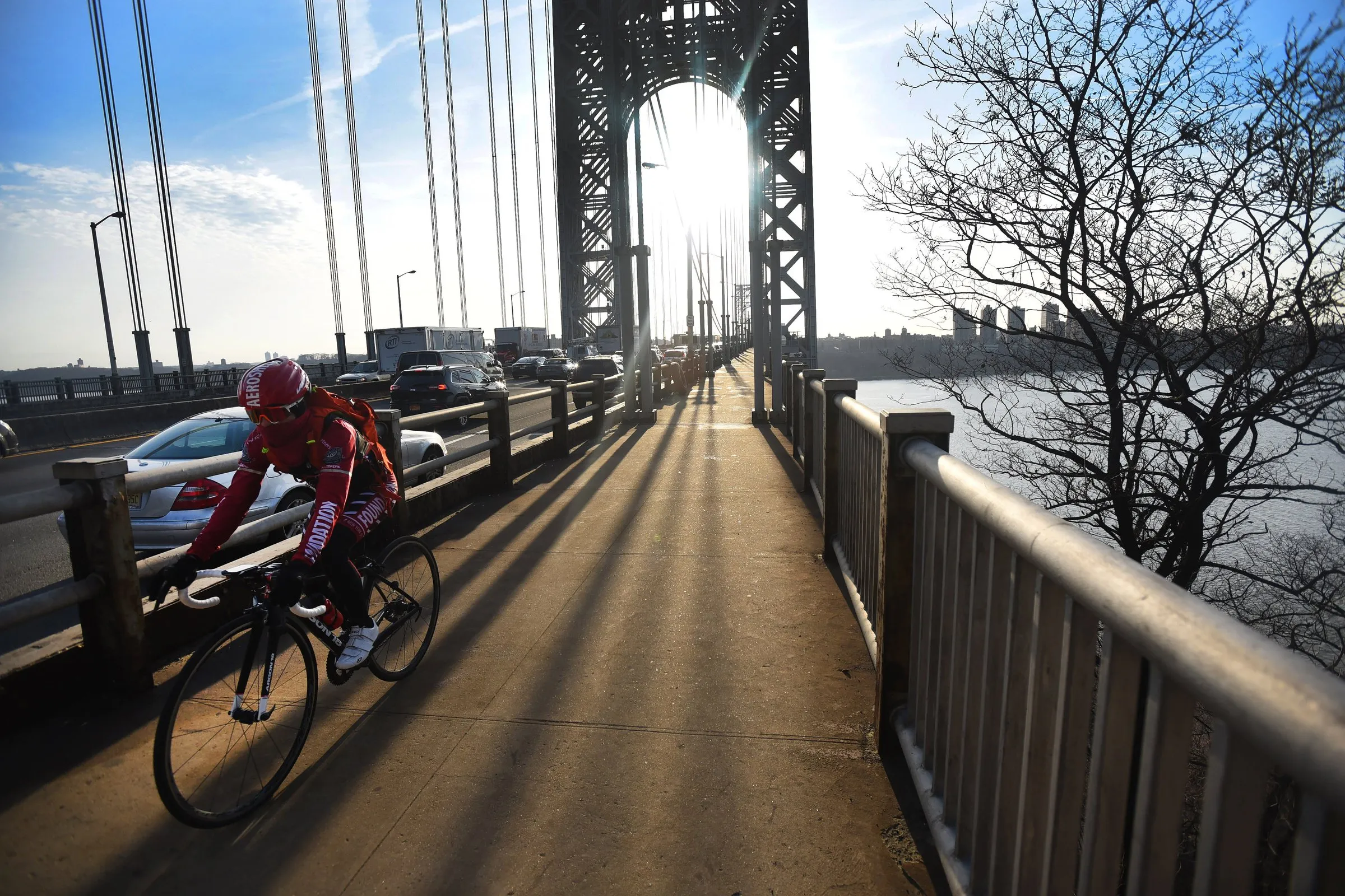 A cyclist rides on the George Washington Bridge from New York, Thursday, March 24, 2016. (Photo by Mitsu Yasukawa/The Record of Bergen County via AP Photo)