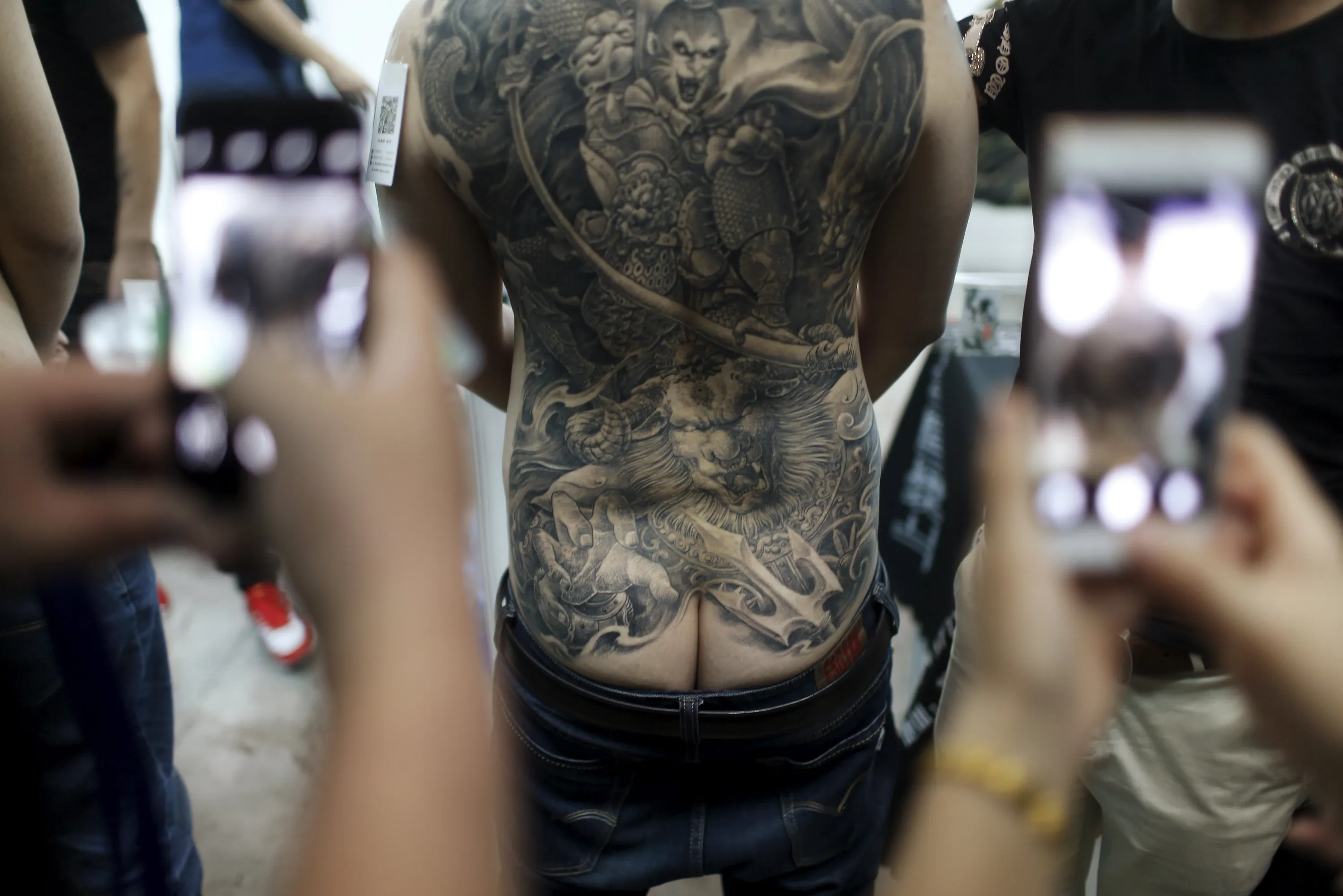 People use their mobile phones to take pictures of a participant after a tattoo contest during an exhibition of 2016 Shanghai International Art Festival Of Tattoos in Shanghai, China, April 22, 2016. (Photo by Aly Song/Reuters)