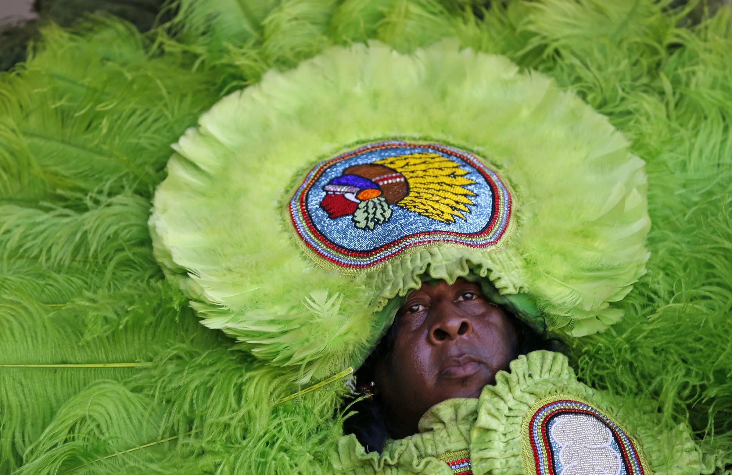 A member of the Mowhawk Hunters Mardi Gras Indians performs at the New Orleans Jazz and Heritage Festival in New Orleans, Saturday, April 23, 2016. (Photo by Gerald Herbert/AP Photo)