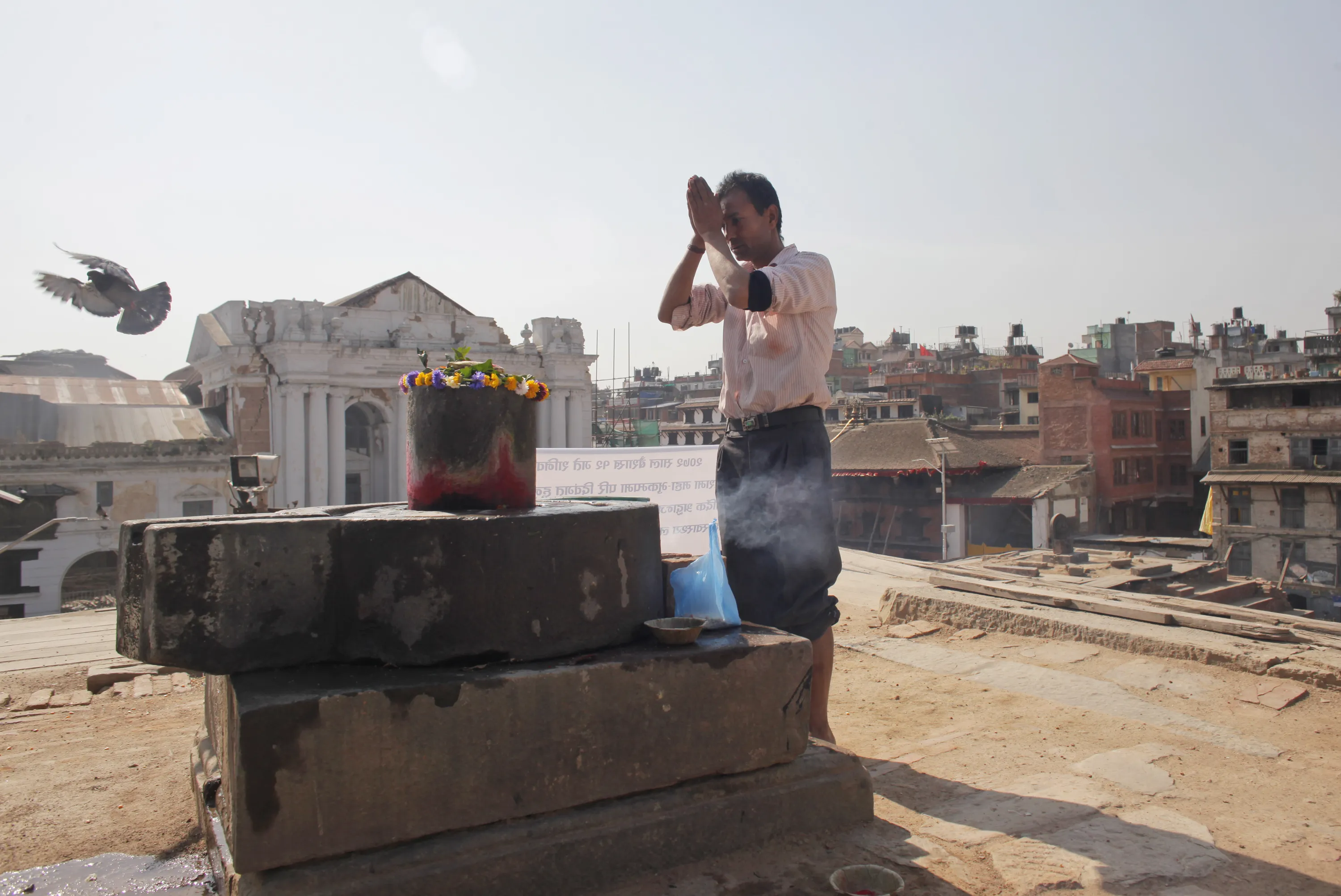 A Nepalese man offers prayers in front of a 'Siva Lingam', symbolic of Hindu god Shiva, as he worships at a temple that was completely destroyed in last year's earthquake at the Basantapur Durbar Square in Kathmandu, Nepal, Sunday, April 24, 2016. (Photo by Niranjan Shrestha/AP Photo)
