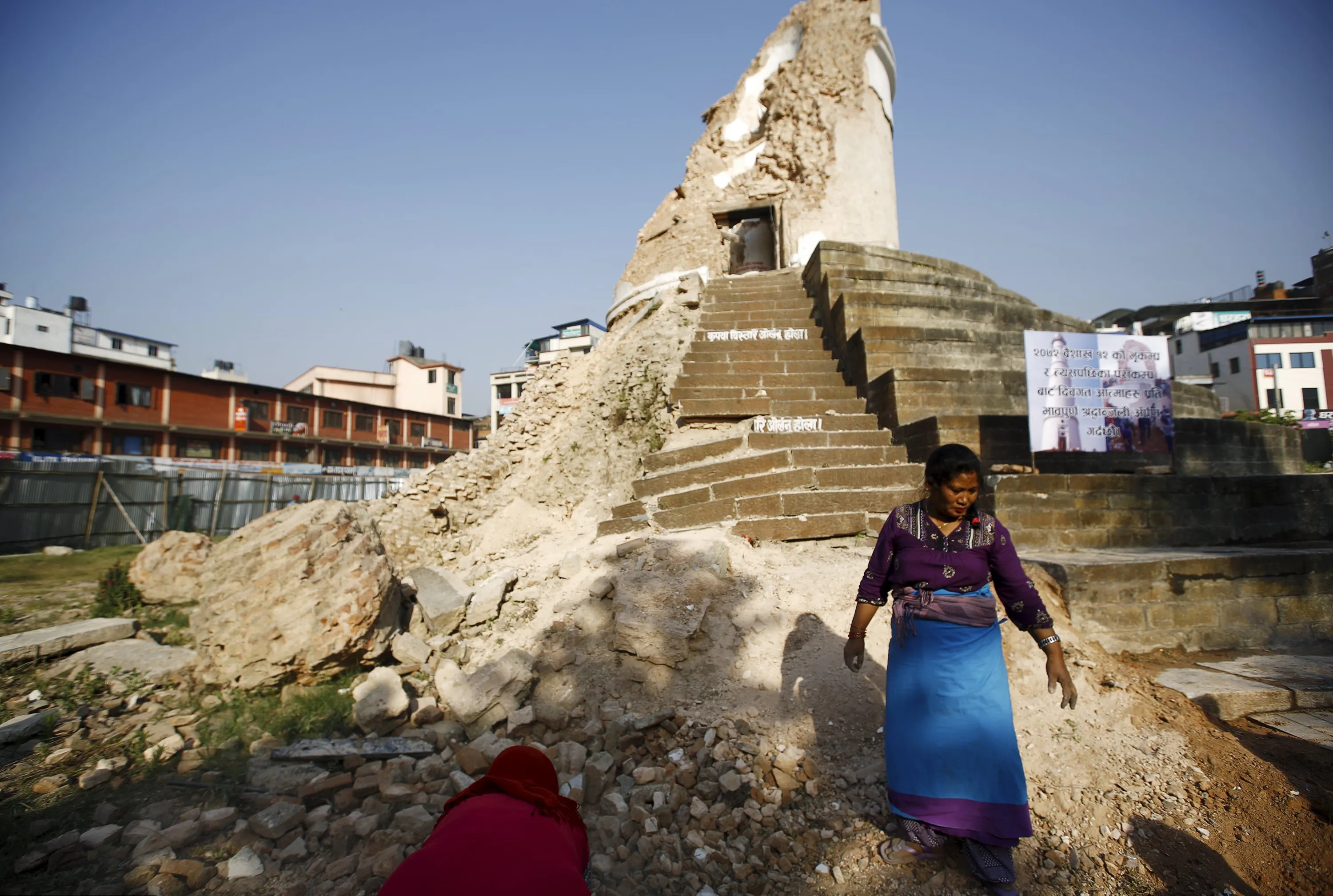 Women clean the premises of the historic nine-storey Dharara tower during the first anniversary of the earthquake in Kathmandu, Nepal, April 24, 2016. (Photo by Navesh Chitrakar/Reuters)