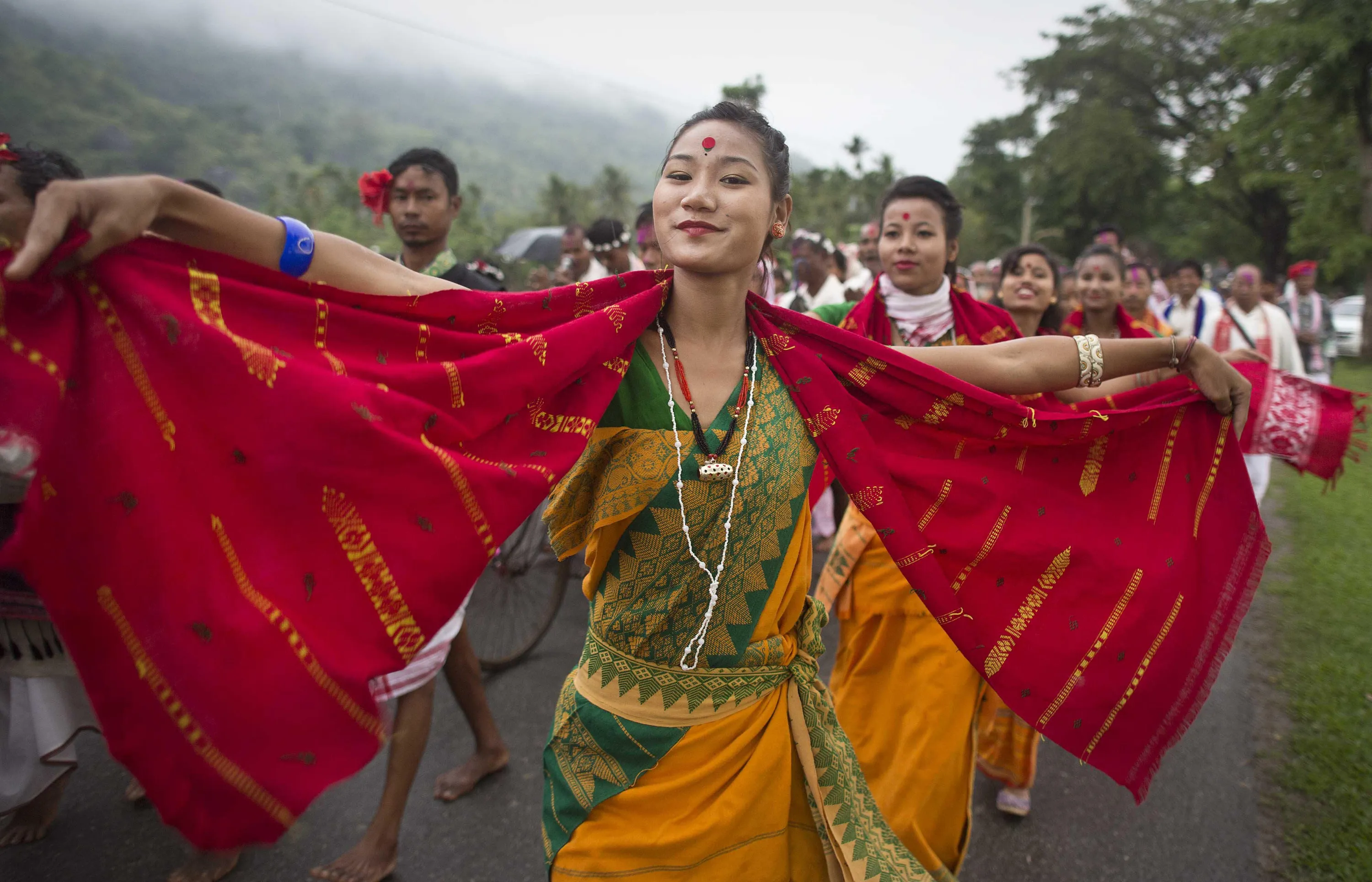 Villagers take part in a procession during the traditional festival Gohain Uliuwa mela in Mayong village, about 50 kilometers (31 miles) east of Gauhati, Assam, India, Tuesday, April 19, 2016.The festival celebrates the Assamese New Year. (Photo by Anupam Nath/AP Photo)