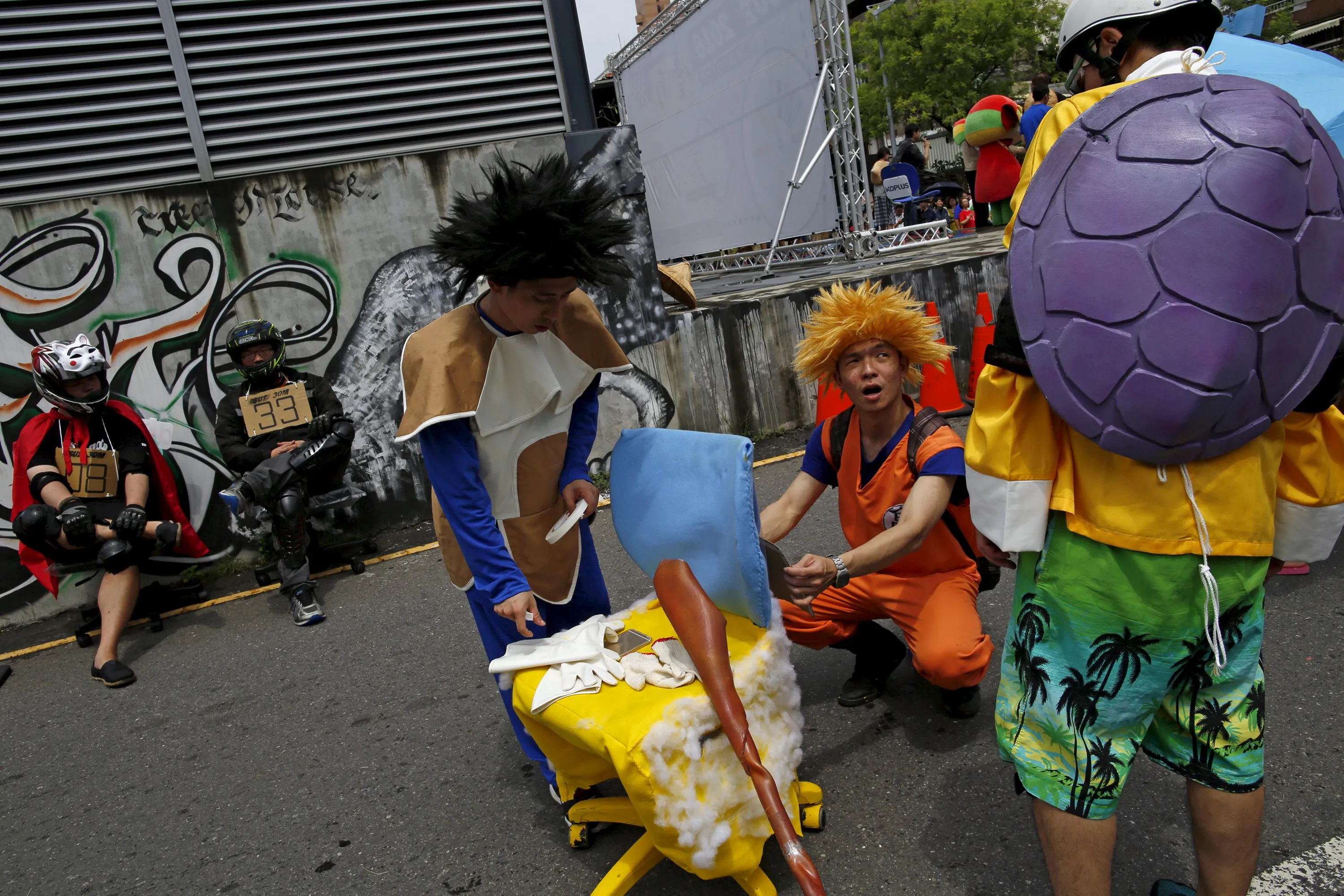 Competitors dressed up as characters from Japanese comic book series “Dragon Ball” take part in the office chair race ISU-1 Grand Prix in Tainan, southern Taiwan April 24, 2016. (Photo by Tyrone Siu/Reuters)