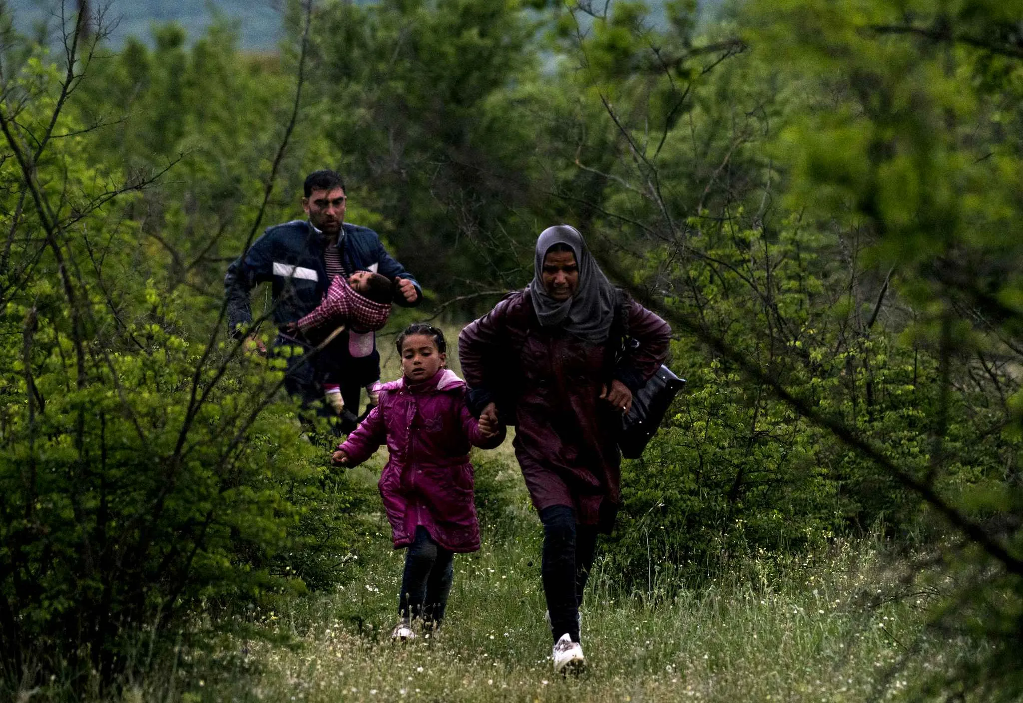 A Syrian family run in a forest in Macedonia after illegally crossing Greek-Macedonian border near the city of Gevgelija on April 23, 2016. Some 50,000 people, many of them fleeing the war in Syria, have been stranded in Greece since the closure of the migrant route through the Balkans in February. (Photo by Joe Klamar/AFP Photo)