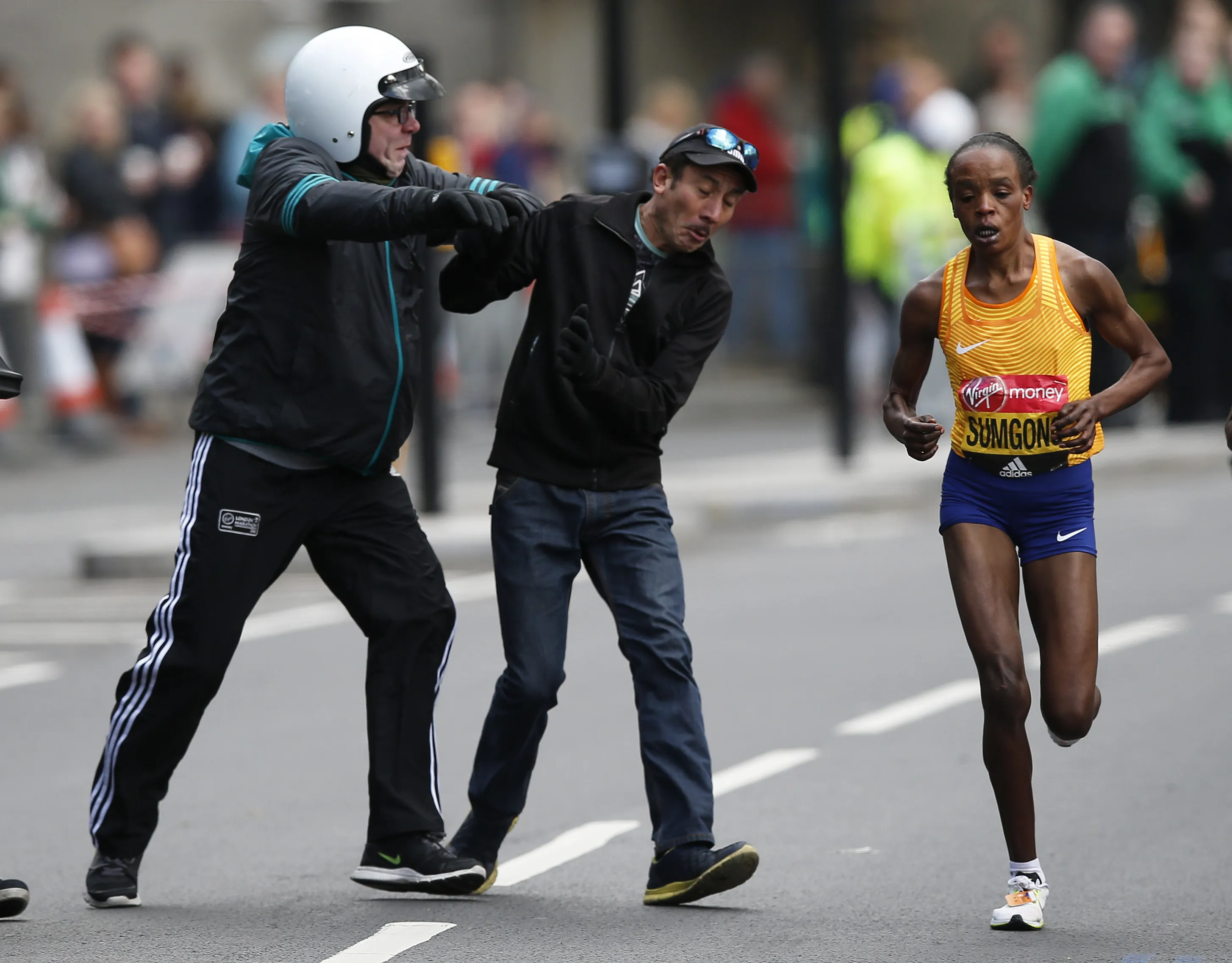 Athletics, 2016 Virgin Money London Marathon, London on April 24, 2016: Kenya's Jemima Sumgong in action as security tackle a spectator during the women's race. (Photo by Peter Cziborra/Reuters/Action Images/Livepic)
