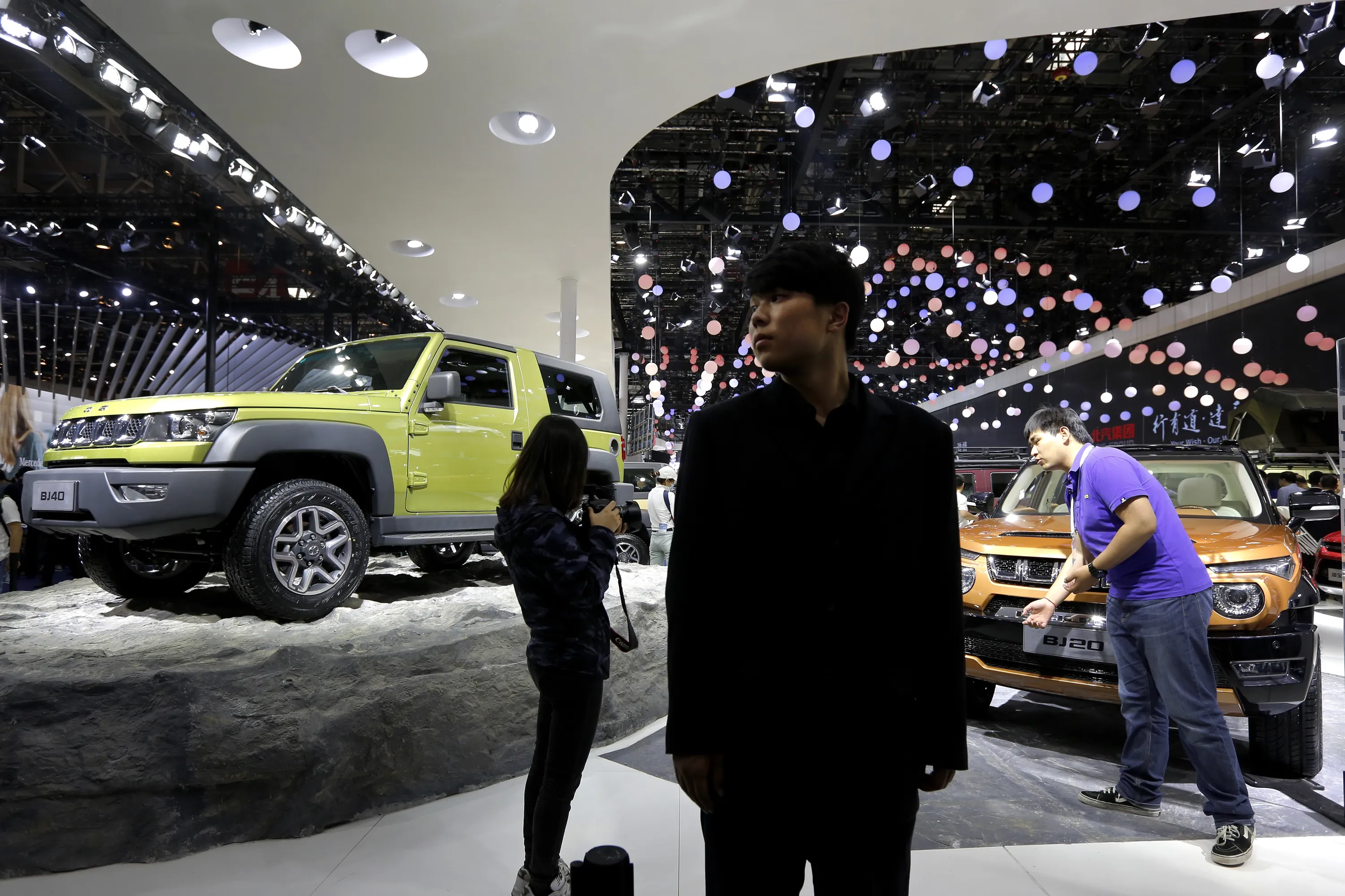 A security stands watch as journalists film the Chinese automaker BAIC Jeep model on display at the Beijing International Automotive Exhibition in Beijing, Monday, April 25, 2016. Automakers showcased a new generation of luxurious SUVs at China's biggest auto show of the year to lure buyers in its cooling, crowded market. (Photo by Andy Wong/AP Photo)