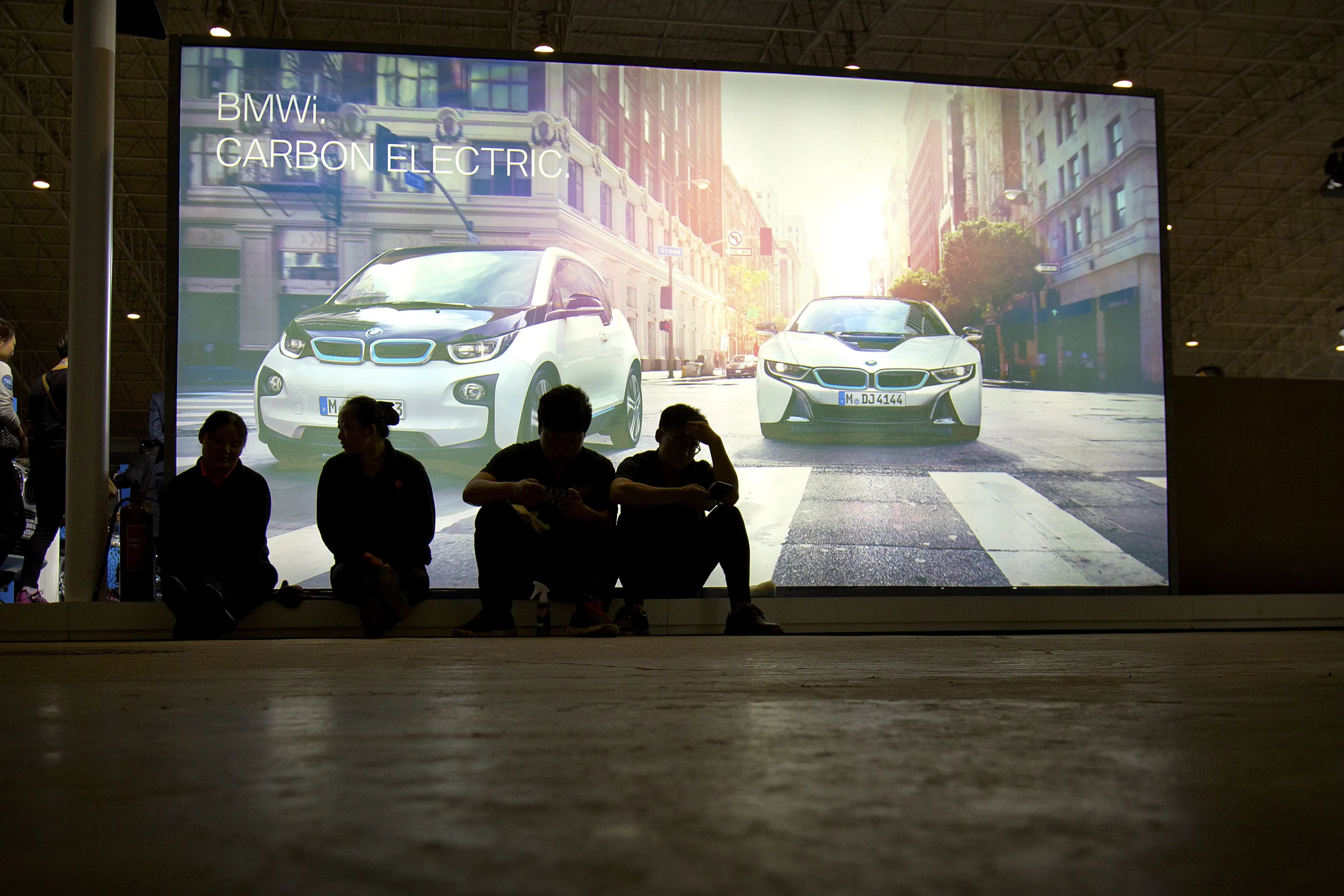 Workers take a break as they sit in front of a illuminated billboard advertising BMW i Series electric vehicles at the Beijing International Automotive Exhibition in Beijing, Monday, April 25, 2016. (Photo by Mark Schiefelbein/AP Photo)