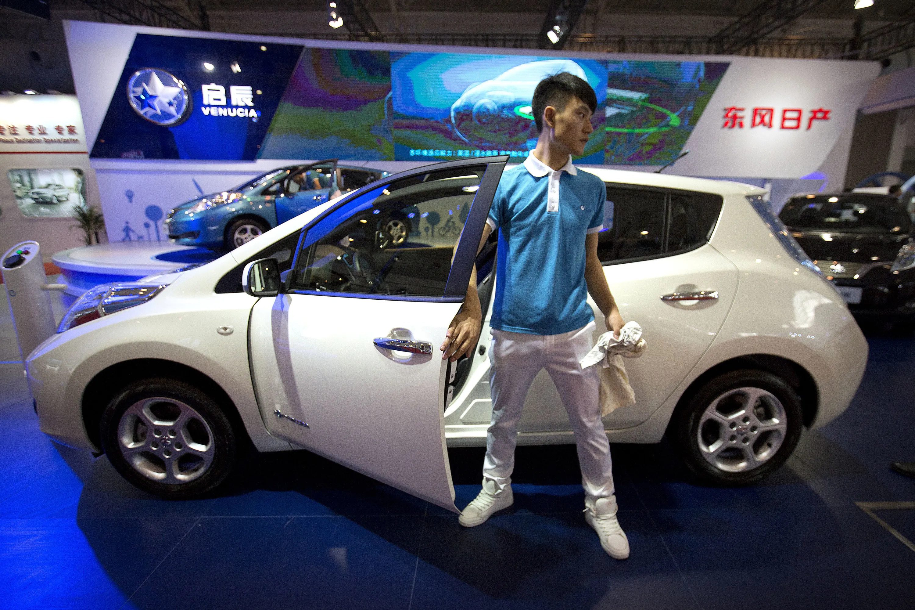 A staff member climbs out of a Morning Wind electric car from Chinese automaker Venucia on display at the Beijing International Automotive Exhibition in Beijing, Monday, April 25, 2016. (Photo by Mark Schiefelbein/AP Photo)