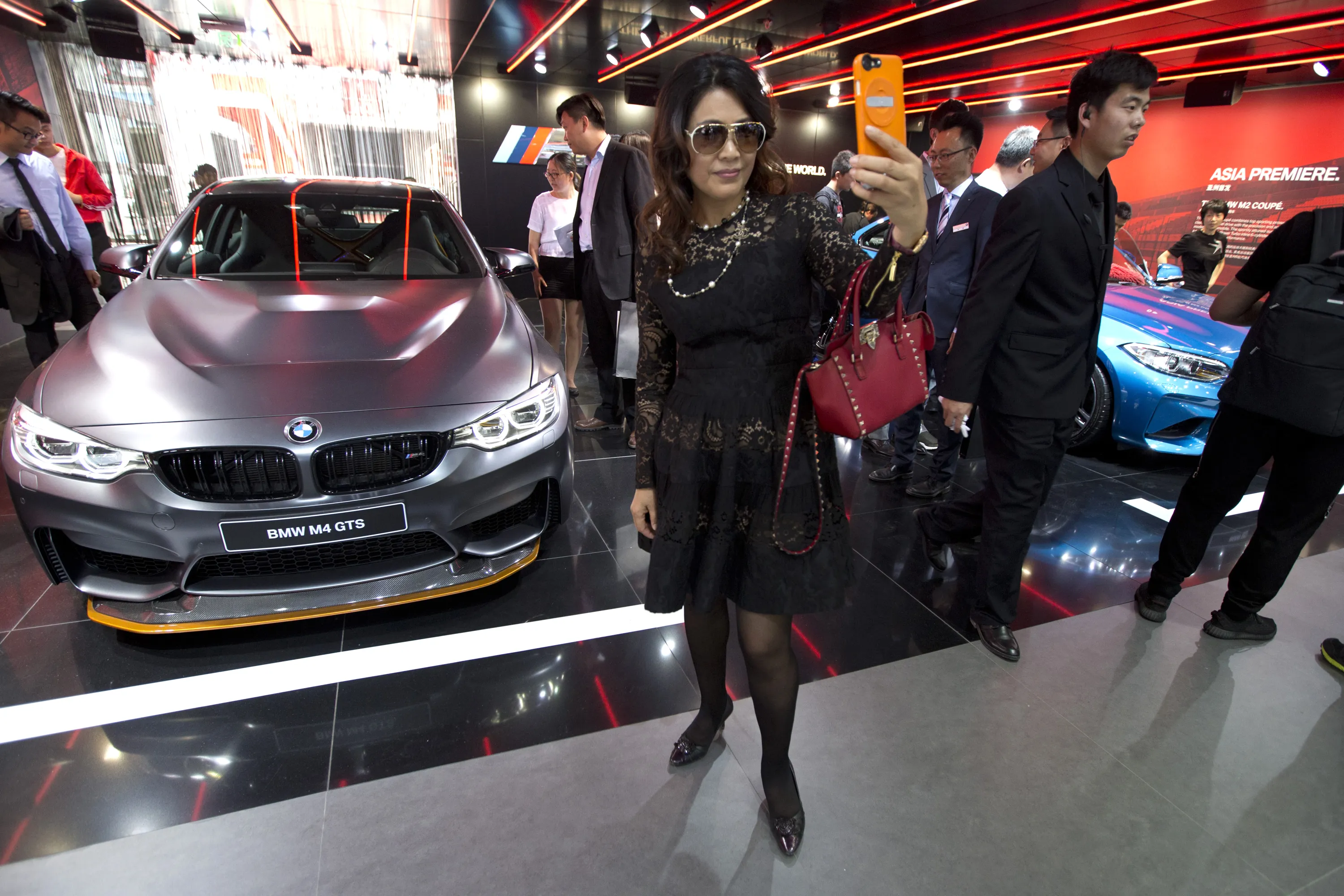 A woman poses for a selfie near the latest car models from BMW displayed at Auto China 2016 in Beijing, China, Monday, April 25, 2016. (Photo by Ng Han Guan/AP Photo)