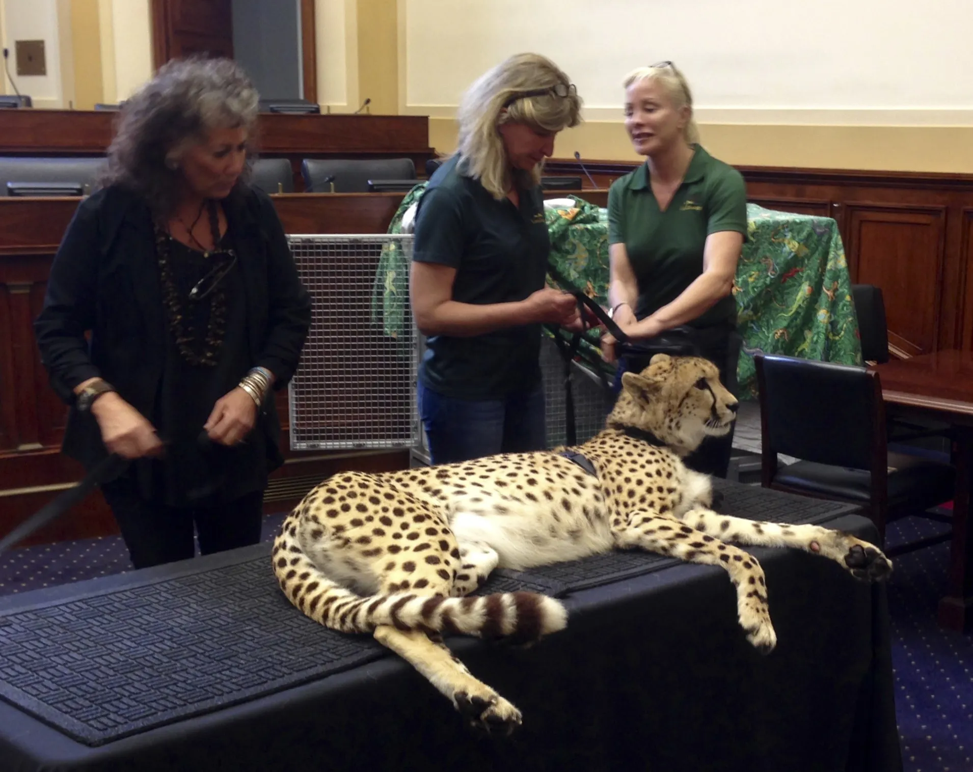 A cheetah named Adaeze rests with handlers, including Laurie Marker, executive director of Cheetah Conservation Fund, left, after an event with the House Foreign Affairs Committee on Capitol Hill in Washington, Monday, April 25, 2016. Adaeze lives at the Leo Zoological Conservation Center in Greenwich, Conn. (Photo by Matthew Daly/AP Photo)