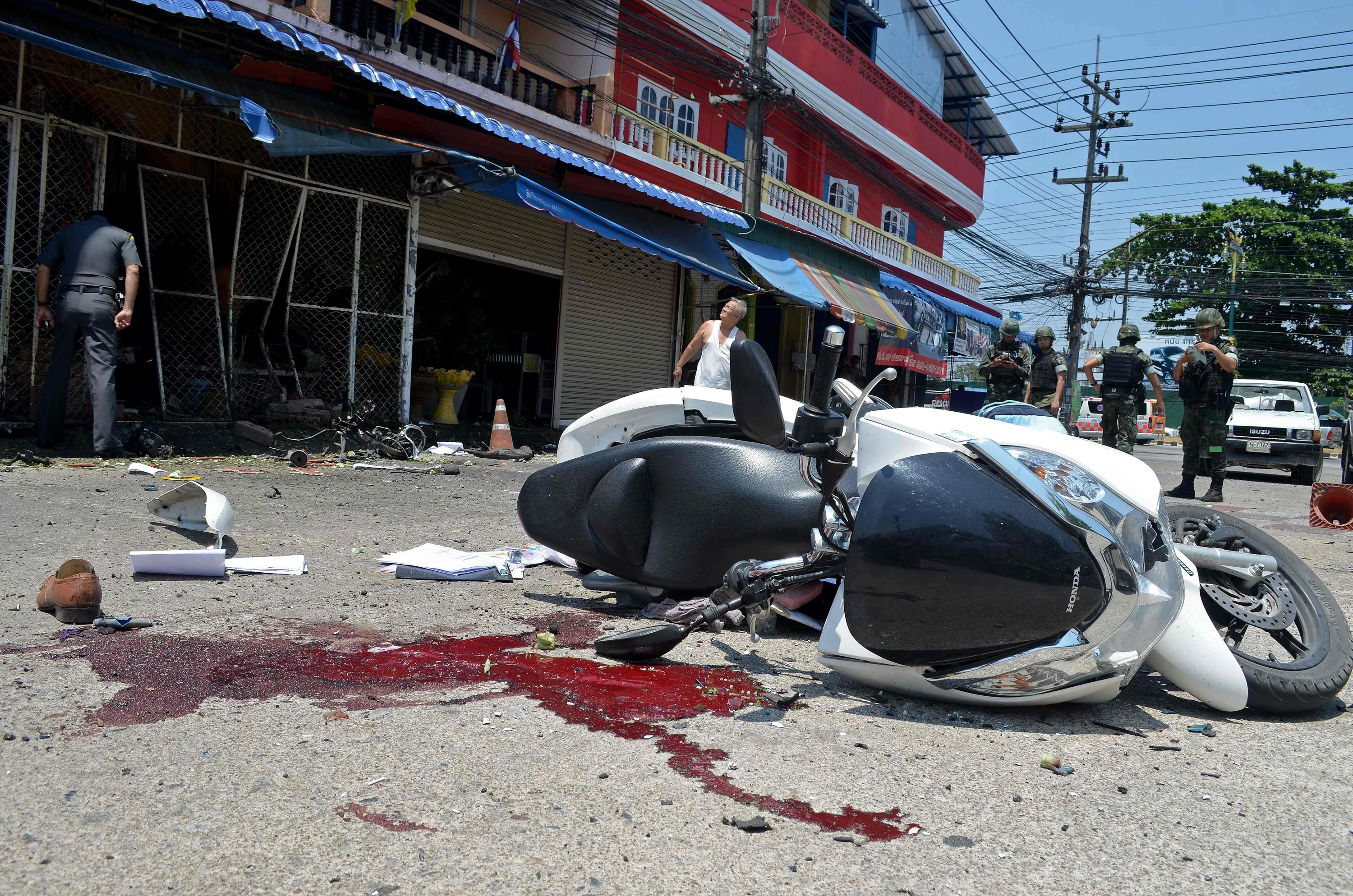 Thai bomb squad members inspect the site of a motorcycle bomb attack which injured 13 people in Thailand's restive southern province of Narathiwat on April 25, 2016. More than 6,500 people have been killed – the majority civilians – since 2004 in clashes between militants and security forces from Thailand's Buddhist-majority state. (Photo by Madaree Tohlala/AFP Photo)