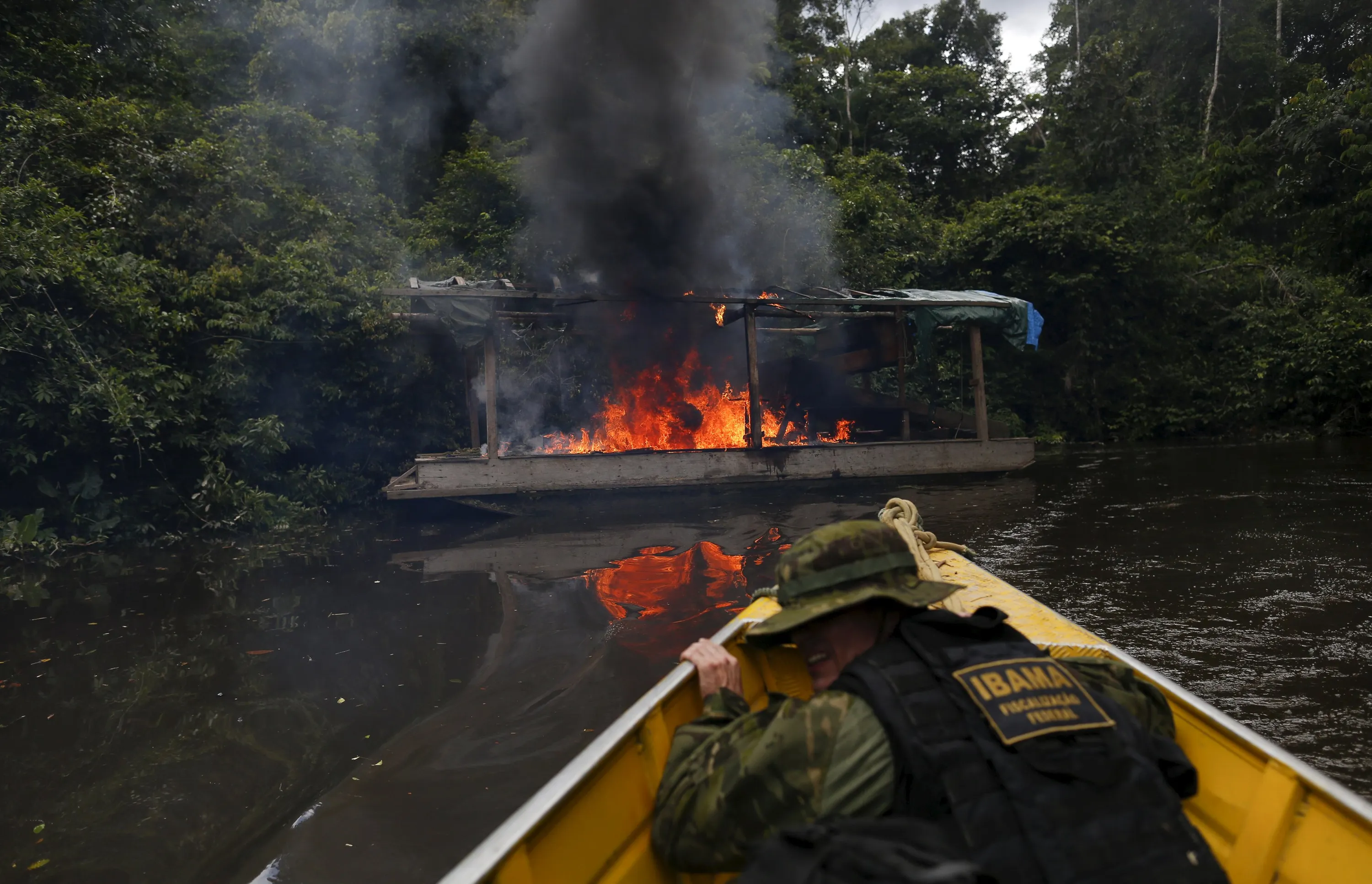 An agent of Brazil’s environmental agency takes cover as an illegal gold dredge burns down at the banks of Uraricoera River during an operation against illegal gold mining on indigenous land, in the heart of the Amazon rainforest, in Roraima state, Brazil April 15, 2016. (Photo by Bruno Kelly/Reuters)