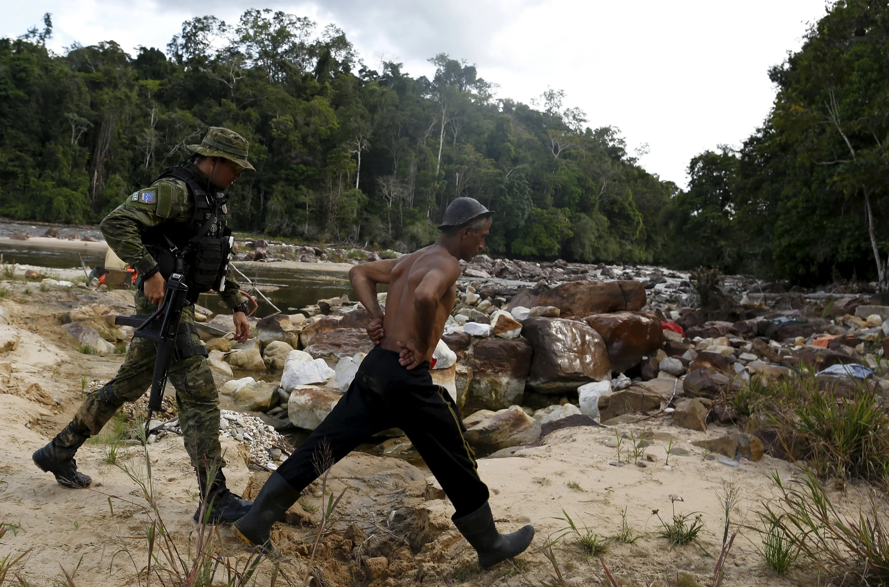 An agent of Brazil’s environmental agency detains a man at an illegal gold mine during an operation against illegal gold mining on indigenous land, in the heart of the Amazon rainforest, in Roraima state, Brazil April 18, 2016. (Photo by Bruno Kelly/Reuters)