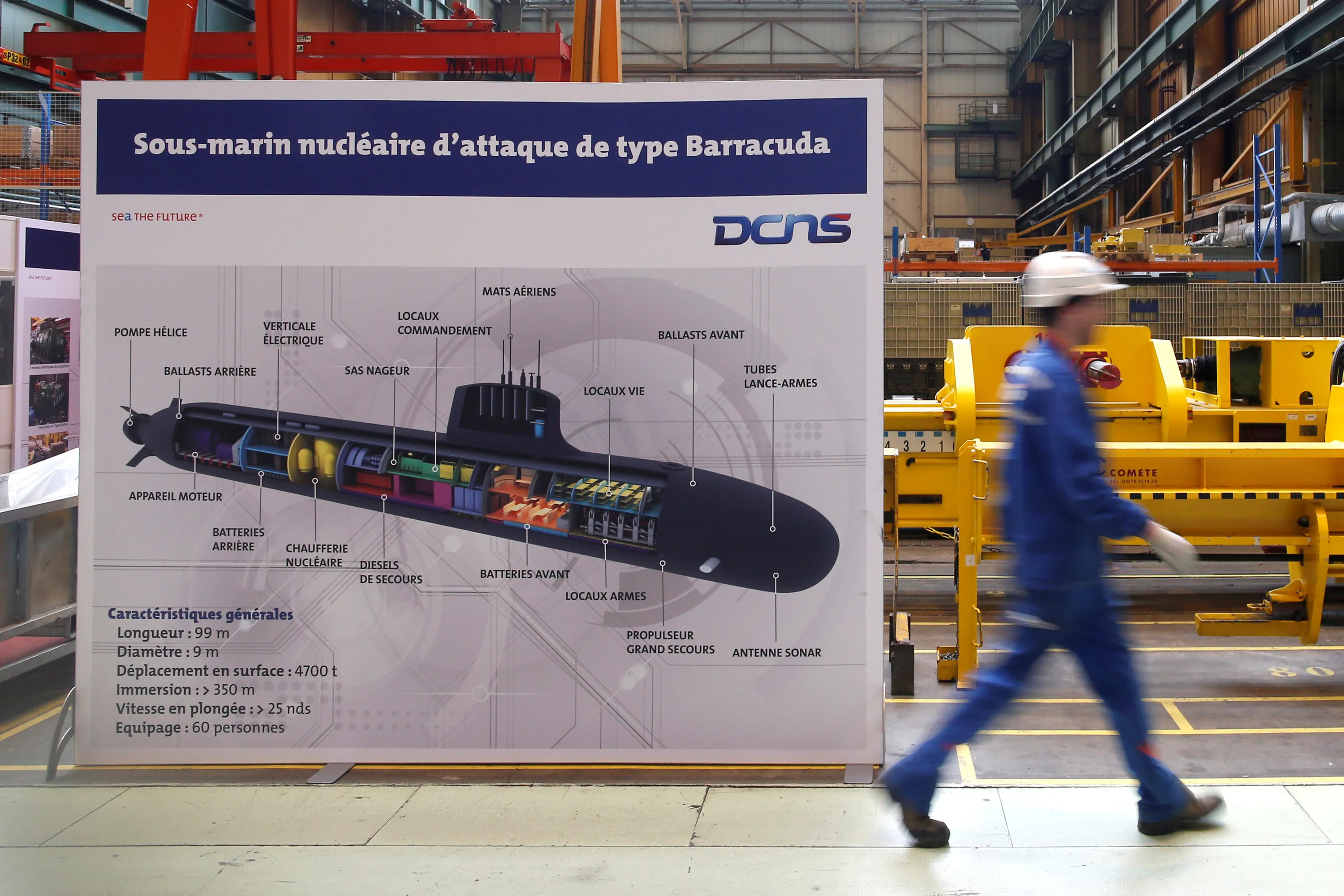 An employee walks past a poster showing a Barracuda submarine at the industrial site of the naval defence company and shipbuilder DCNS in La Montagne near Nantes, France, April 26, 2016. (Photo by Stephane Mahe/Reuters)