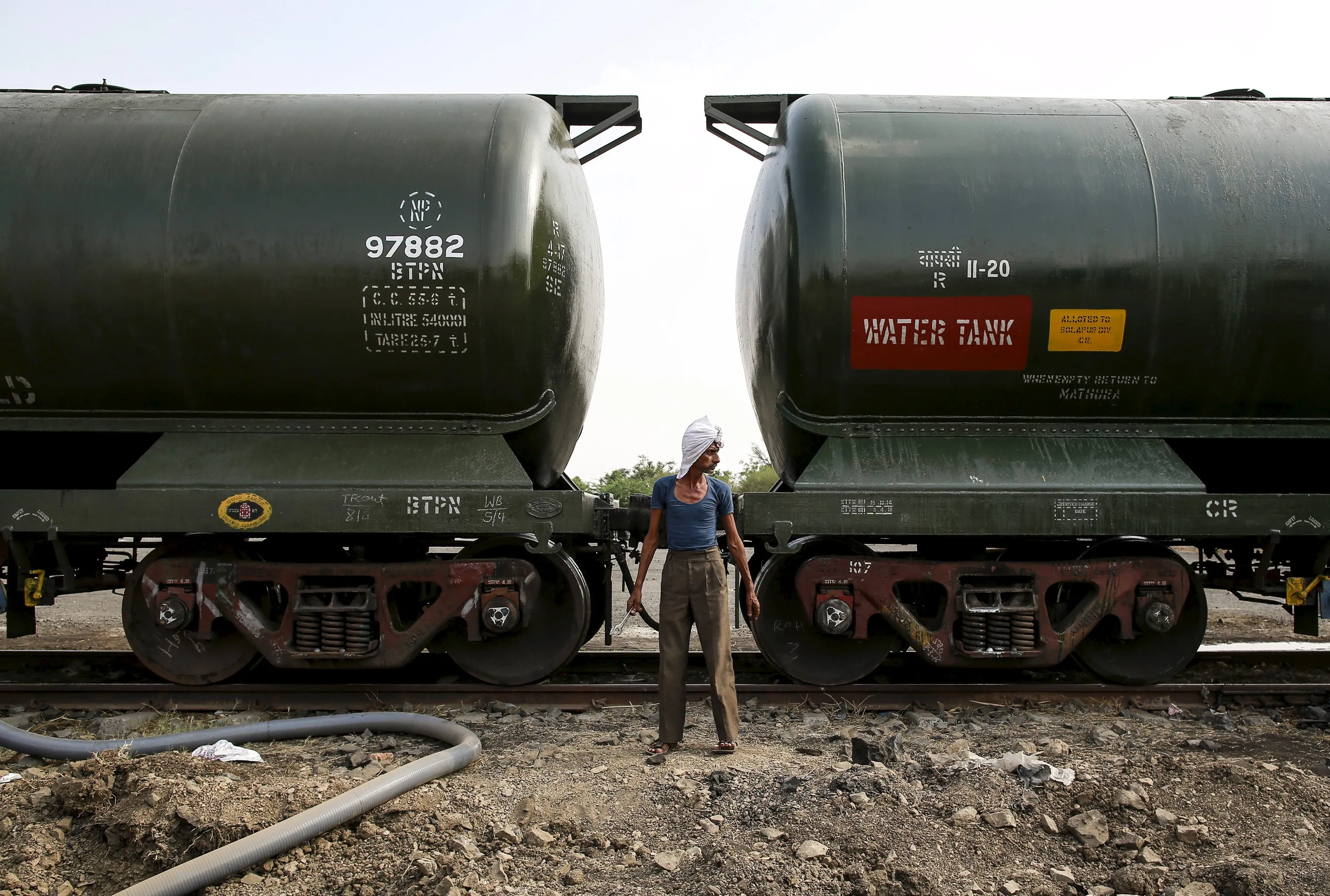 A worker stands in front of a tanker wagon carrying water at a railway station in Latur, India, April 16, 2016. (Photo by Danish Siddiqui/Reuters)