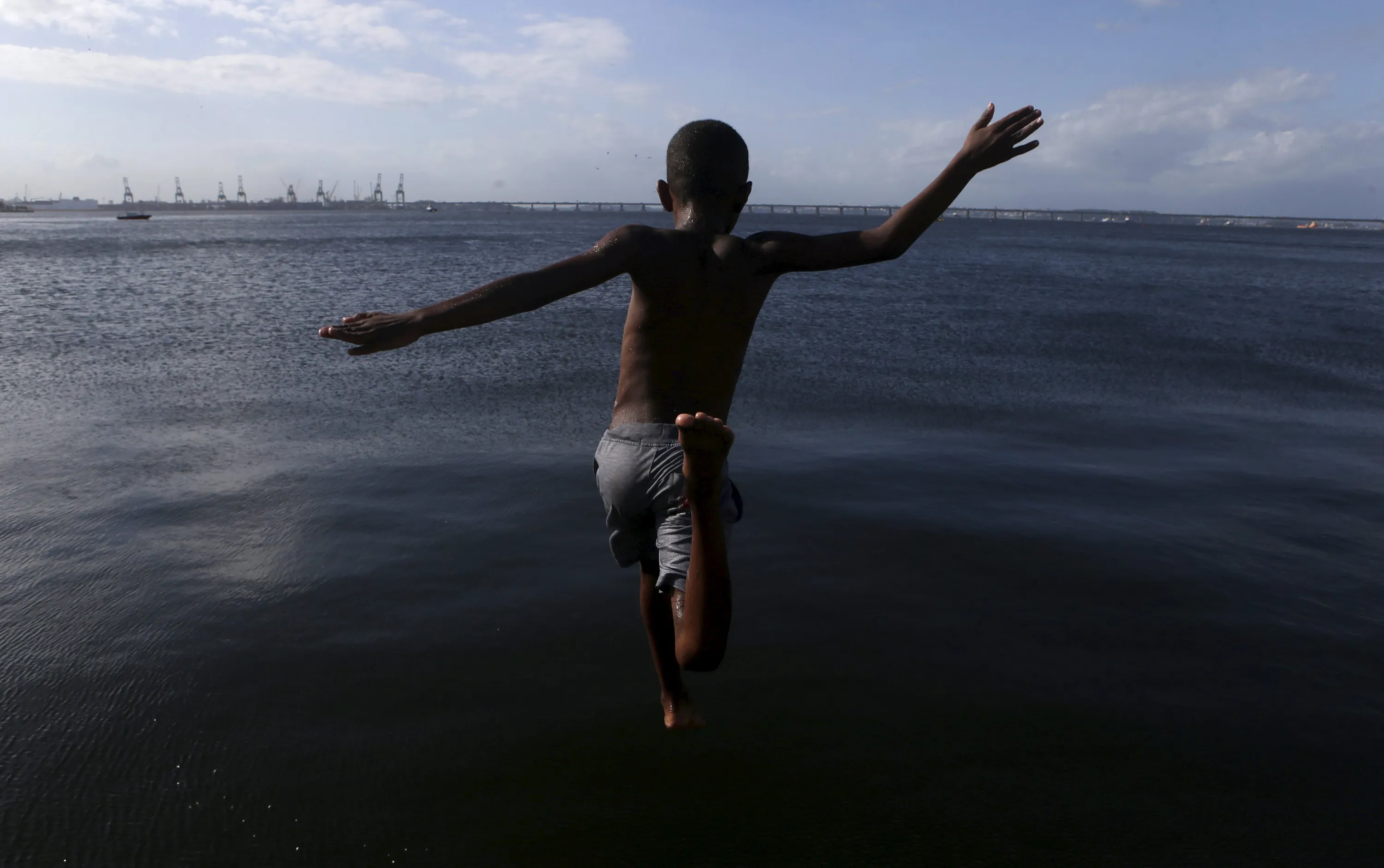 A child jumps into the waters of Guanabara Bay in Rio de Janeiro's downtown Brazil, January 5, 2016. (Photo by Ricardo Moraes/Reuters)