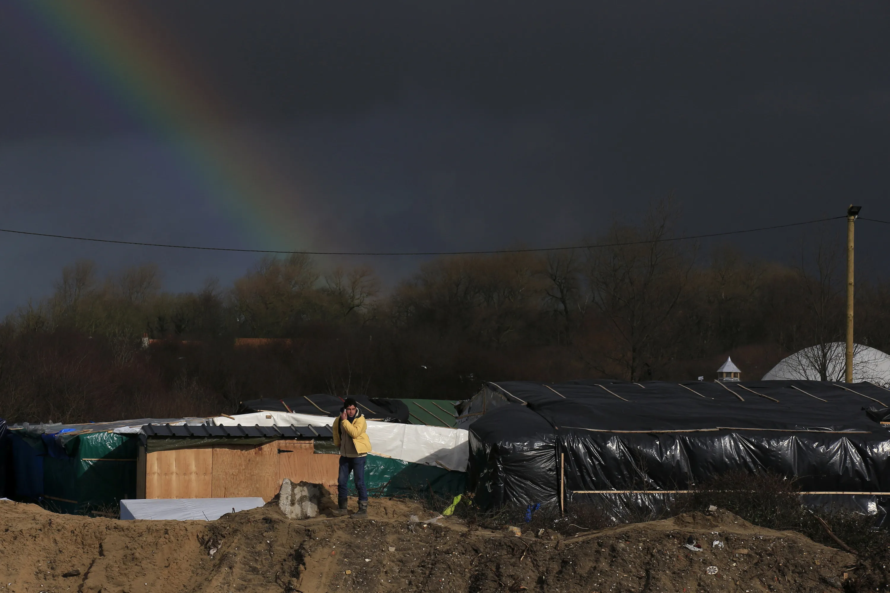 A rainbow is seen over the “Jungle” as a migrant stands on top of a pile of sand which separates the road that leads to the ferry terminal and a squalid sprawling camp in Calais, northern France, February 15, 2016. (Photo by Pascal Rossignol/Reuters)