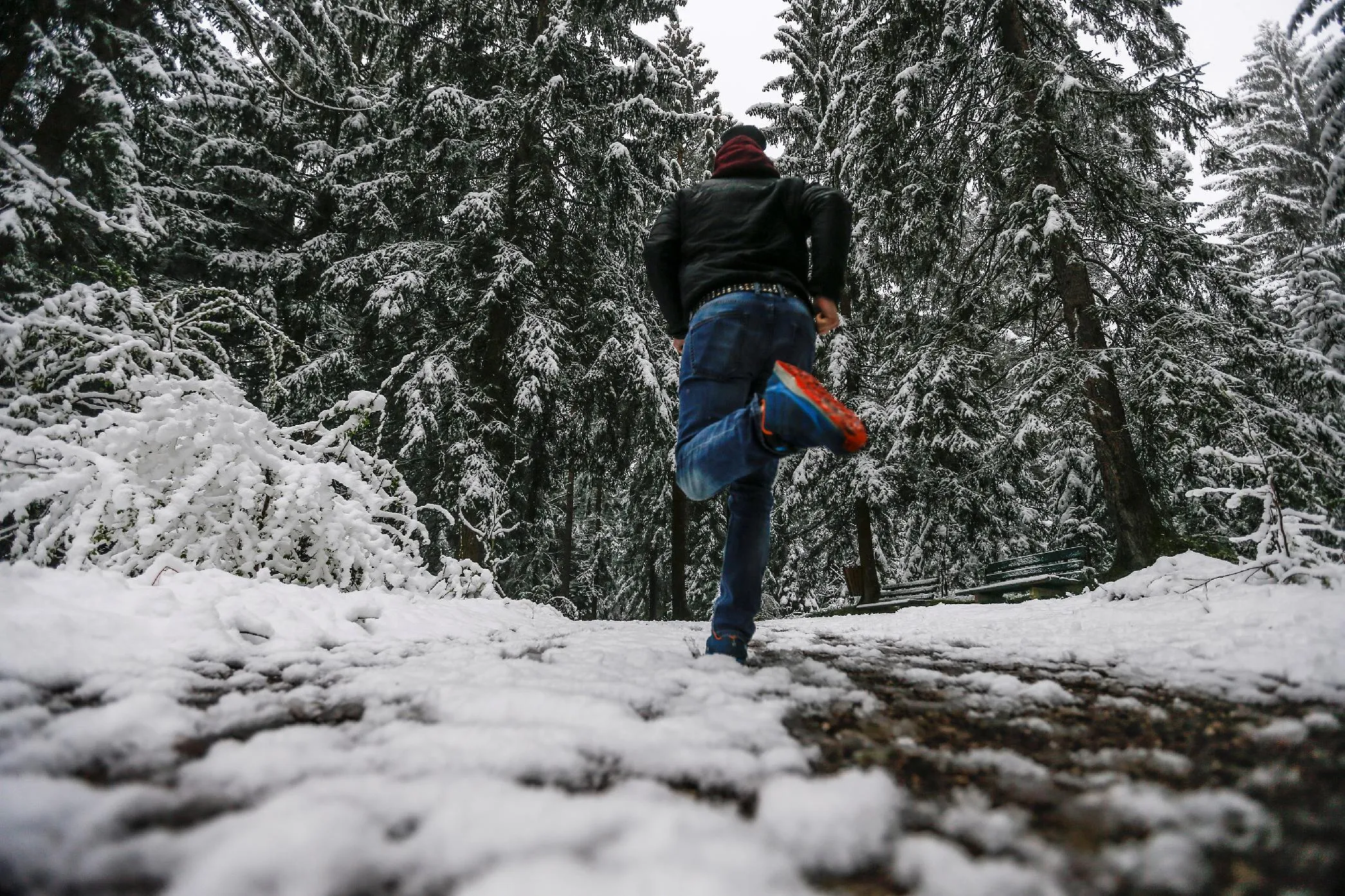 A man runs on a snow covered path in Gnadenwald, Austria, April 27, 2016. (Photo by Dominic Ebenbichler/Reuters)