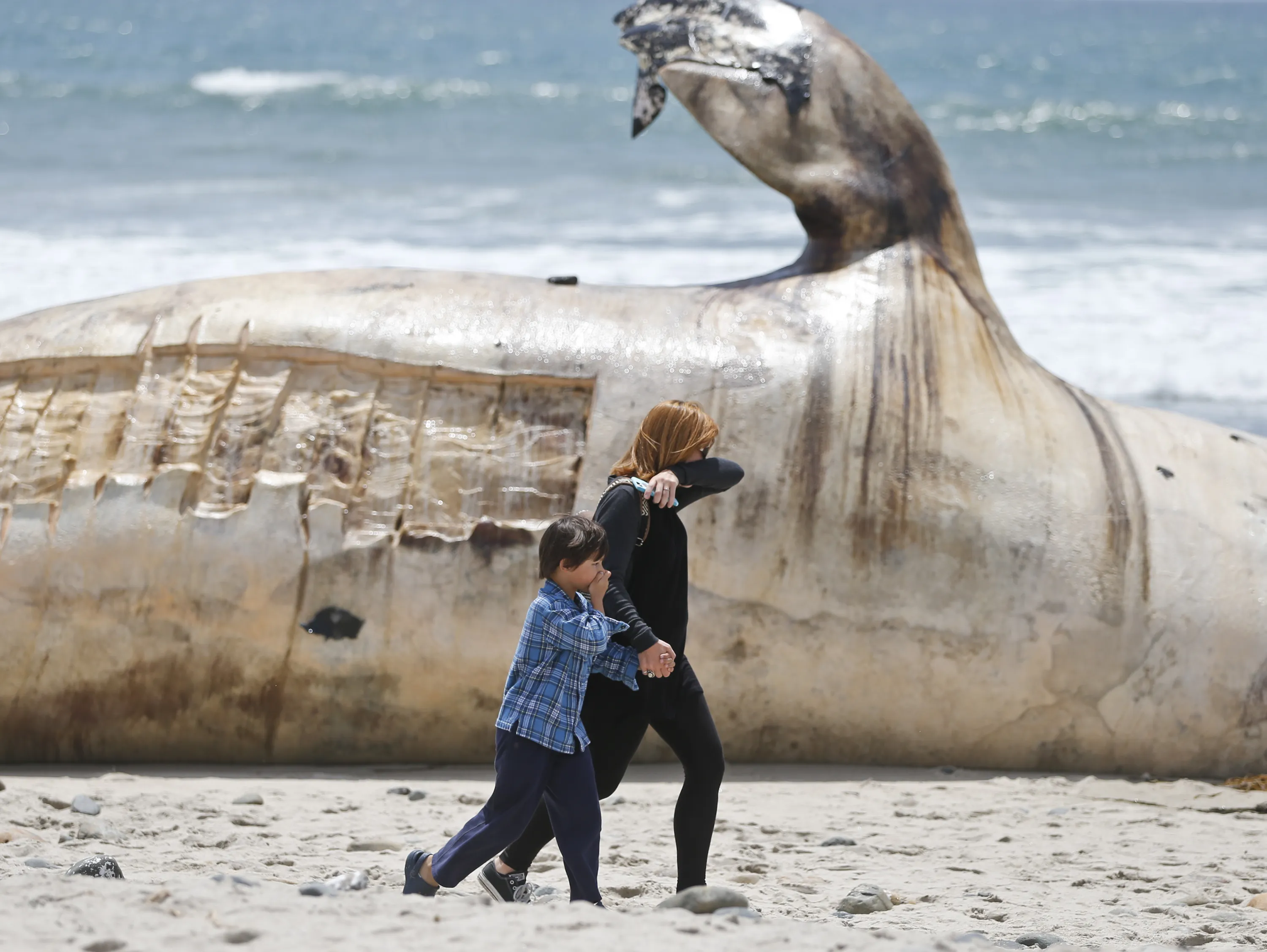 A woman and a young boy cover part of their noses as the walk past a massive carcass of a whale at a popular California surfing spot Tuesday, April 26, 2016, in San Clemente, Calif. Authorities are trying to decide what to do with the massive, rotting carcass. (Photo by Lenny Ignelzi/AP Photo)