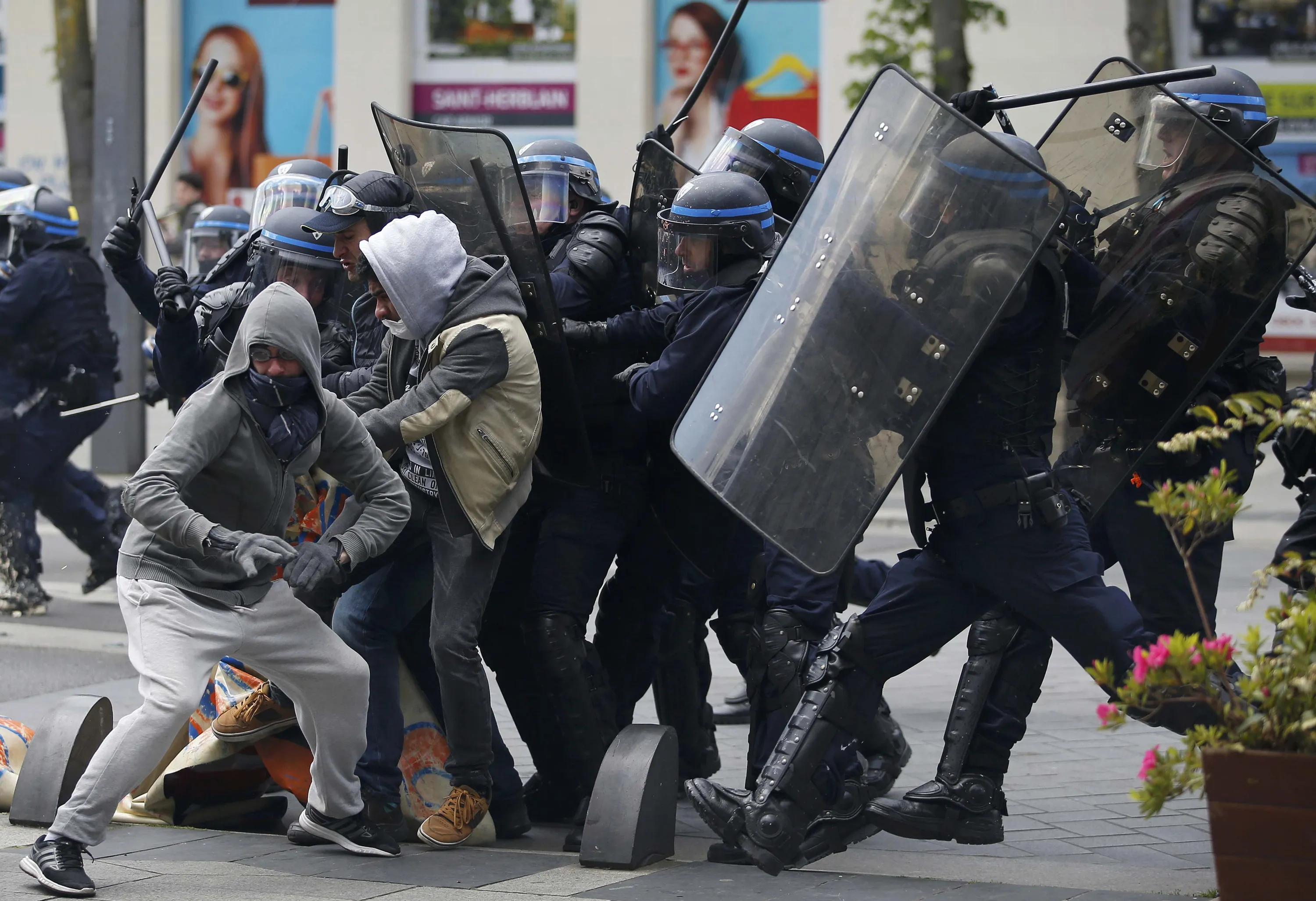 French riot police officers clash with protestors during a demonstration against the French labour law proposal in Nantes, France, as part of a nationwide labor reform protests and strikes, April 28, 2016. (Photo by Stephane Mahe/Reuters)