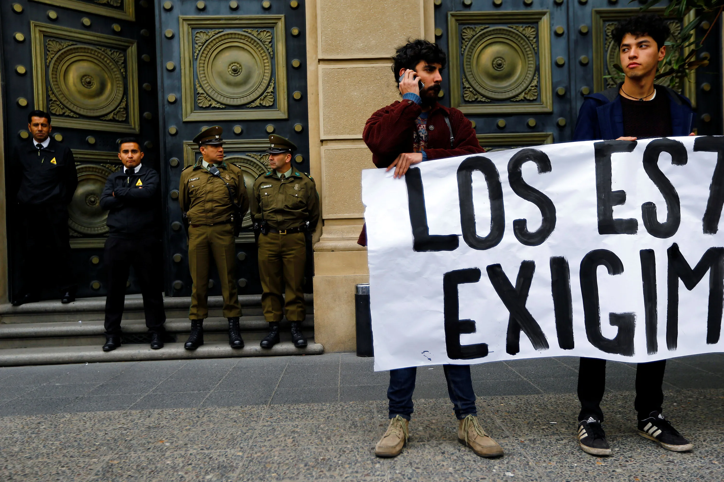 Student protesters hold a banner outside the ministry of finance building during a rally to demand changes in the education system in Santiago, Chile April 28, 2016. The words on the banner are part of a slogan that says, “Students demand dignity”. (Photo by Ivan Alvarado/Reuters)