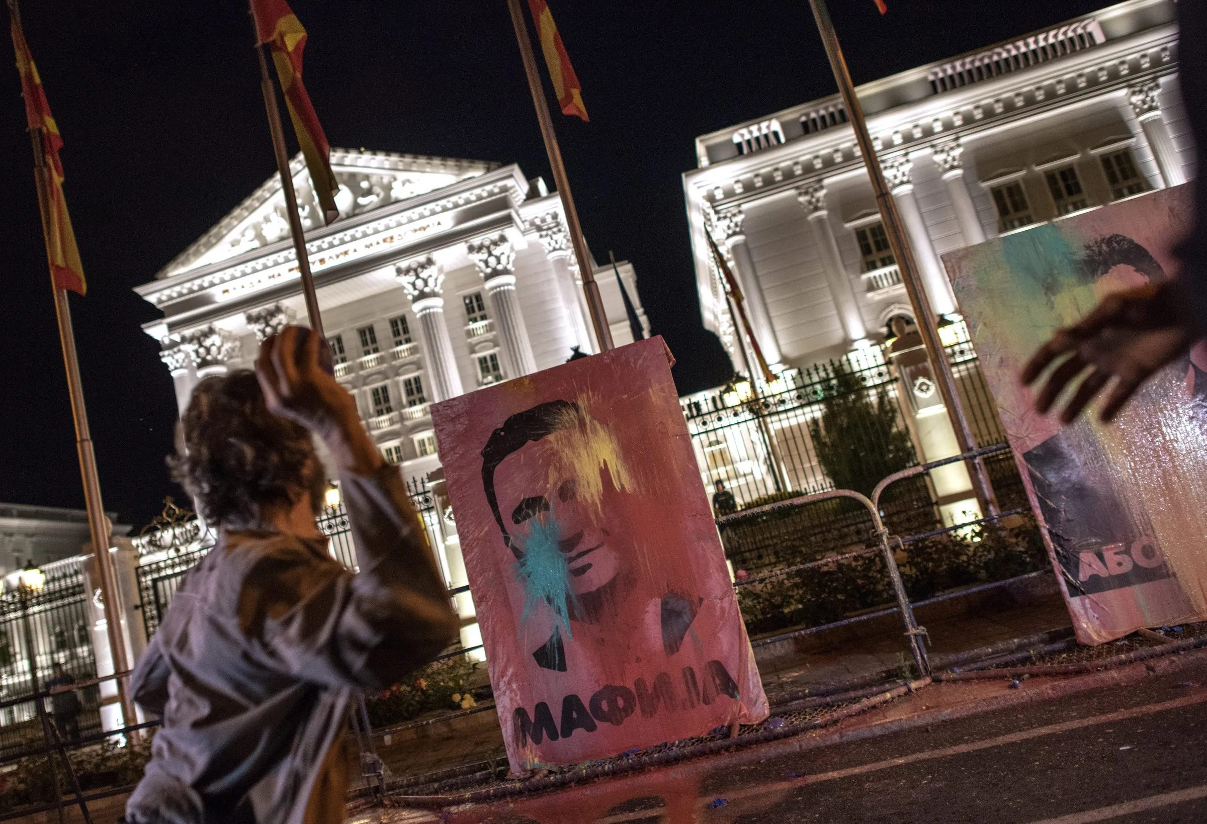 Protestors hit the pictures of Former Macedonian Prime Minister Nikola Gruevski (L) and Macedonian President George Ivanov (R) with balloons filled with paint in front of the government building, during the protest dubbed “colorful revolution” against Macedonian President Ivanov's decision on wiretapping amnesty, in Skopje, The Former Yogoslav Republic of Macedonia, 27 April 2016. Ivanov on 12 April decided to abolish all judicial cases related to the big wire-tapping scandal that brought the country to early general elections scheduled for 05 June. The crisis started in 2015 when opposition SDSM started to publish illegally recorded wire-tapped phone conversations of the highest Governmental officials claiming they show financial crime and eventual evidences of electoral frauds of the ruling conservative VMRO-DPMNE party of then PM Gruevski. Gruevski denied everything saying “foreign intelligence services” are trying to topple his Government he was administrating from 2006. (Photo by Georgi Licovski/EPA)