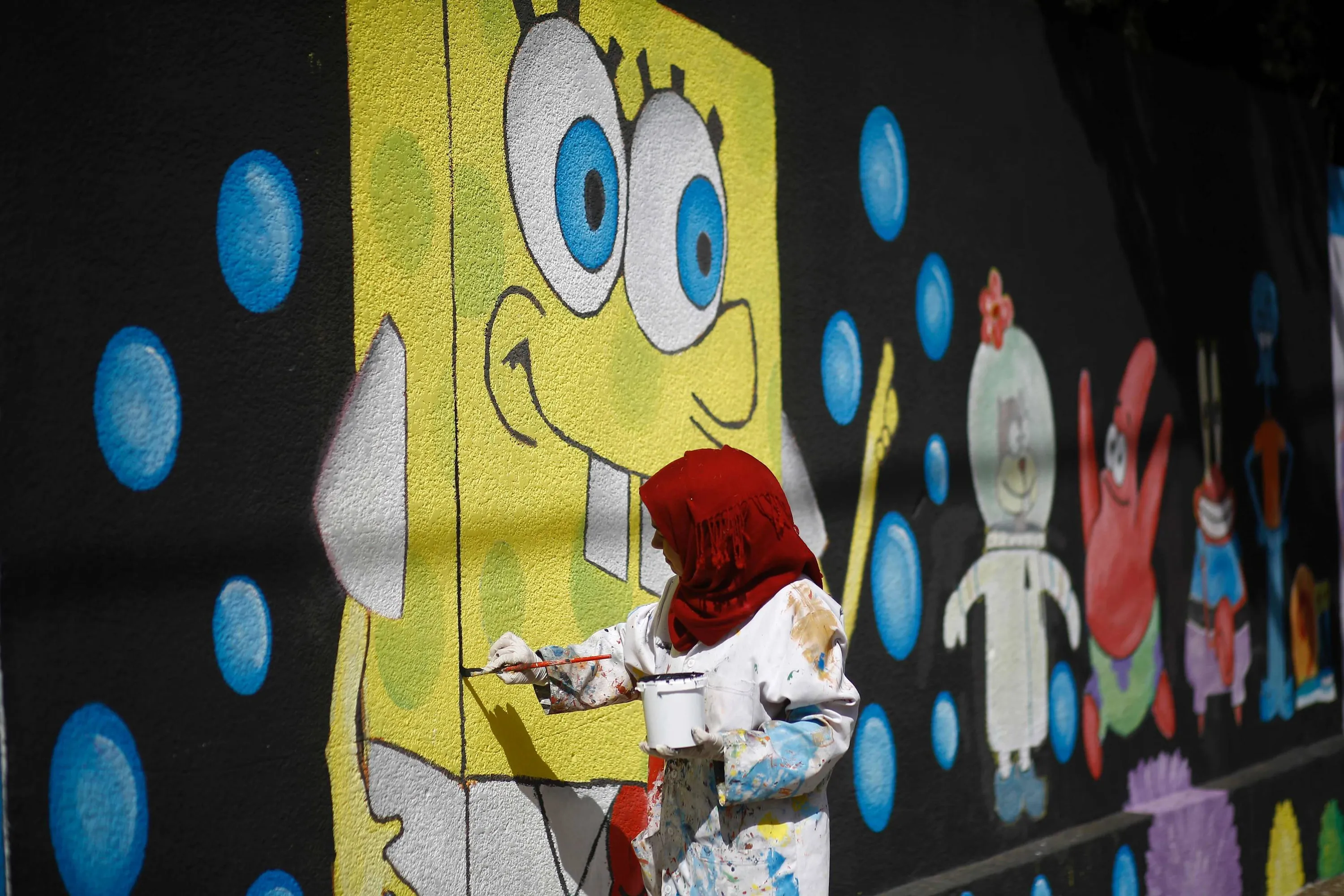 A Palestinian artist paints murals on the walls of a school run by the United Nations Relief and Works Agency for Palestine refugees (UNRWA) on April 28, 2016 in Gaza City as part of the projects UNRWA carries out in Gaza. (Photo by Mohammed Abed/AFP Photo)