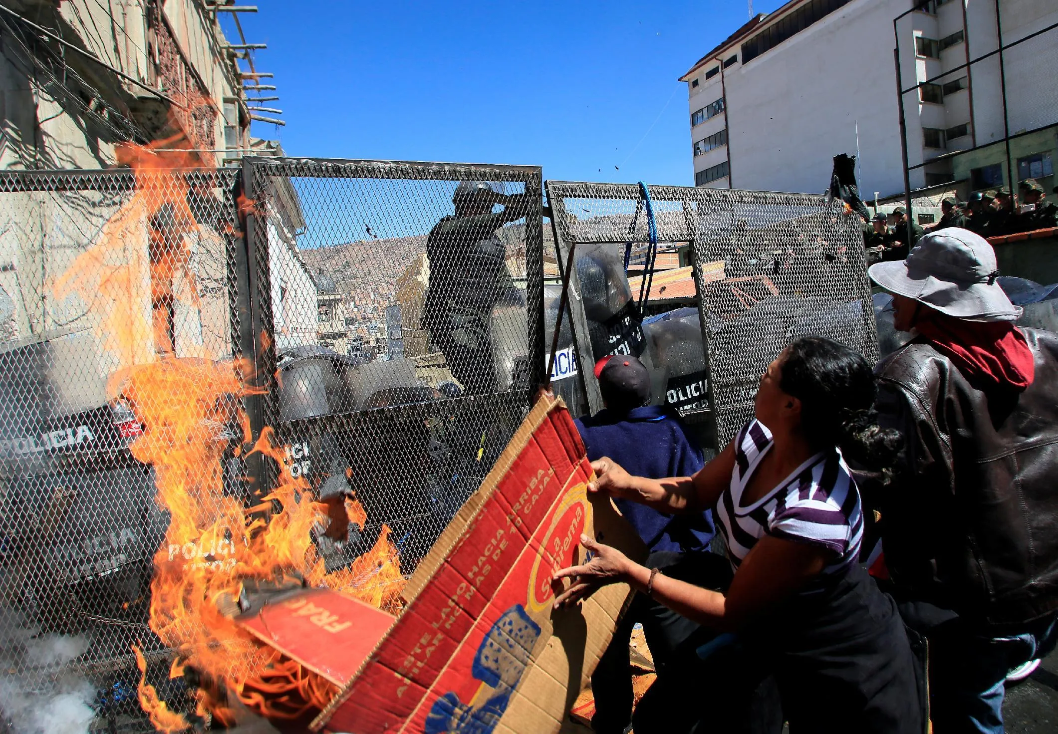 Demonstrators try to set fire to a police barricade, during a protest by people with physical disabilities demanding the government to increase their monthly disability subsidy, in La Paz, Bolivia, April 29, 2016. (Photo by David Mercado/Reuters)