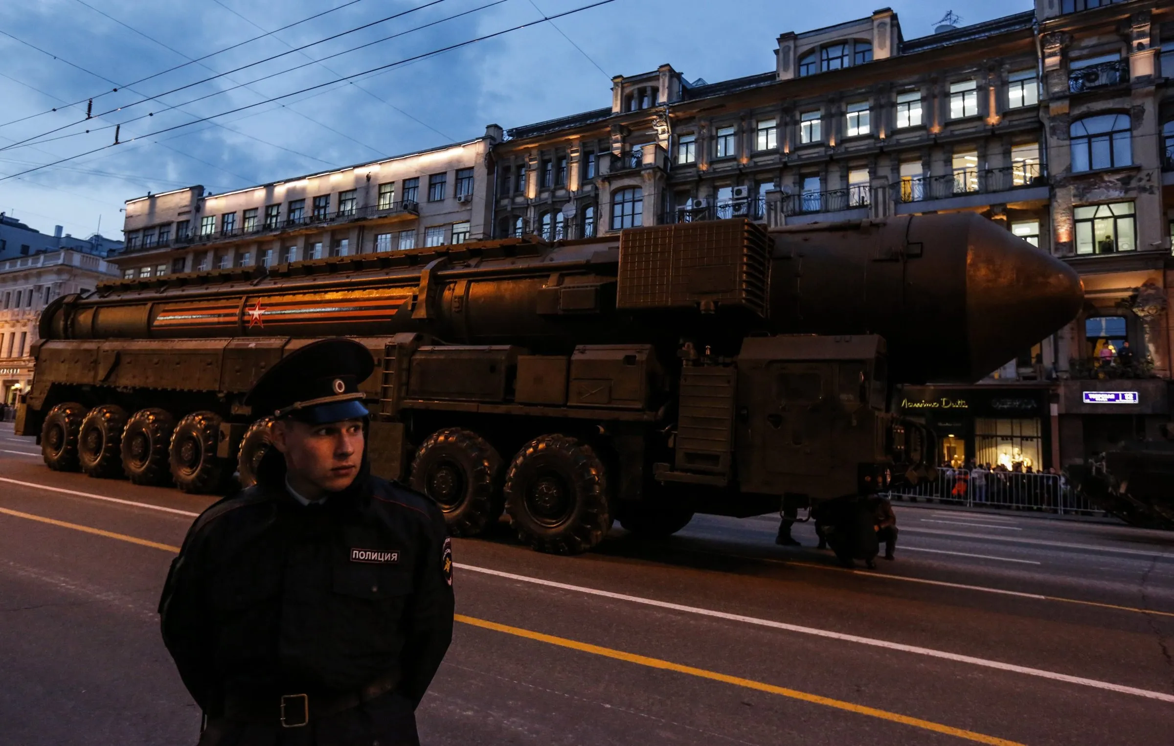 Russian policeman guards a Russian strategic ballistic missiles RS-24 Yars launching vehicle during the rehearsal for a military parade in Moscow, Russia, 28 April 2016. The Victory Day parade on 09 May 2016 marks the 71th anniversary since the capitulation of Nazi Germany. (Photo by Sergei Ilnitsky/EPA)