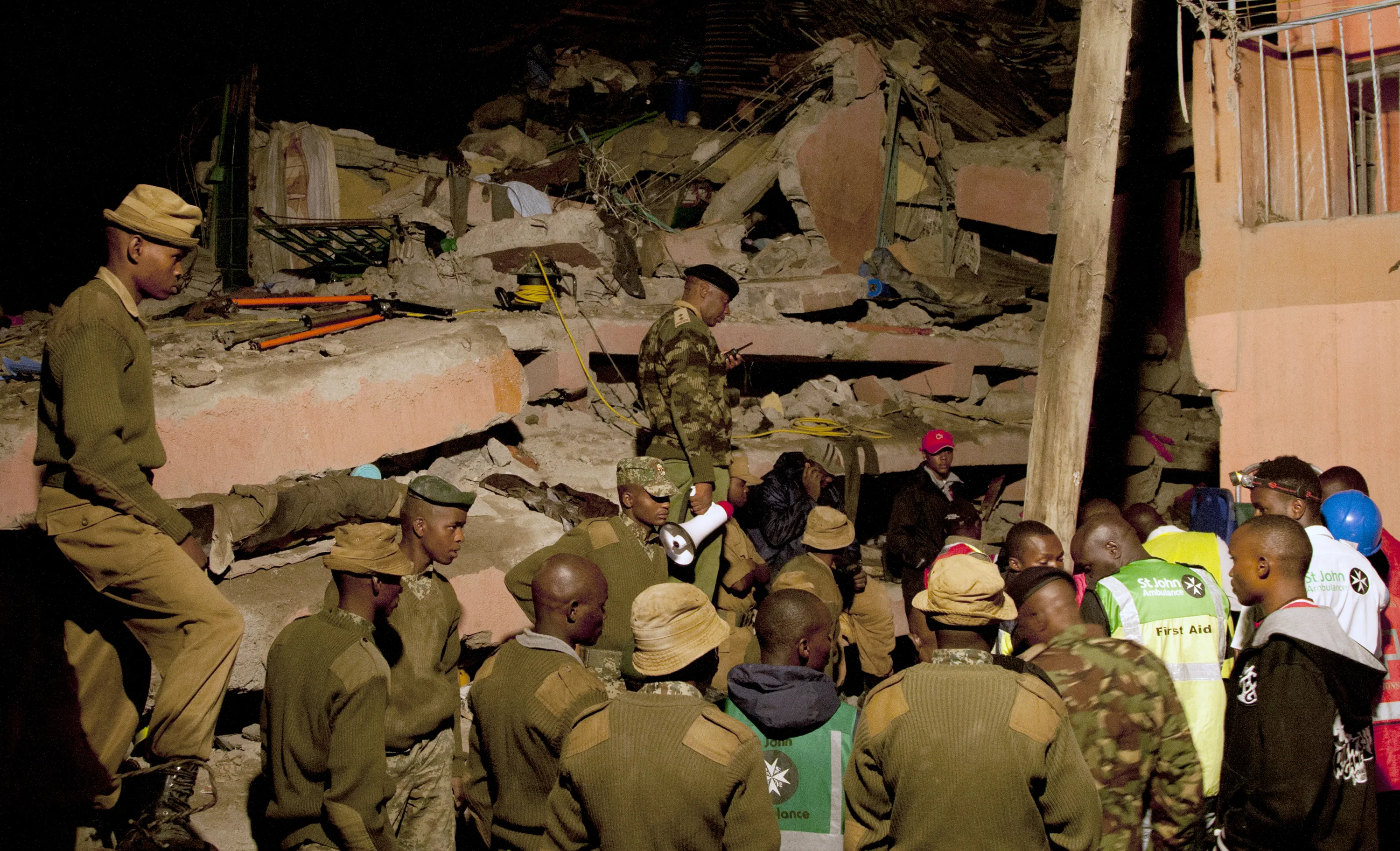 Kenyan National Youth Servicemen work at the site of a building collapse in Nairobi, Kenya, Saturday, April 30, 2016. (Photo by Sayyid Abdul Azim/AP Photo)