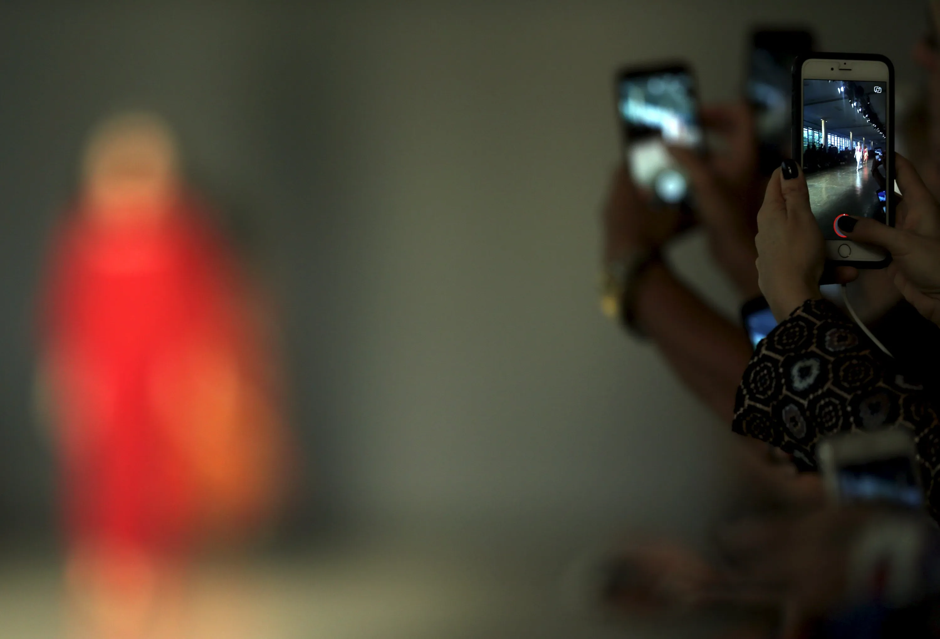Spectators use their mobile phones to record a model displaying creation from the Iodice collection during Sao Paulo Fashion Week in Sao Paulo, Brazil, April 27, 2016. (Photo by Paulo Whitaker/Reuters)
