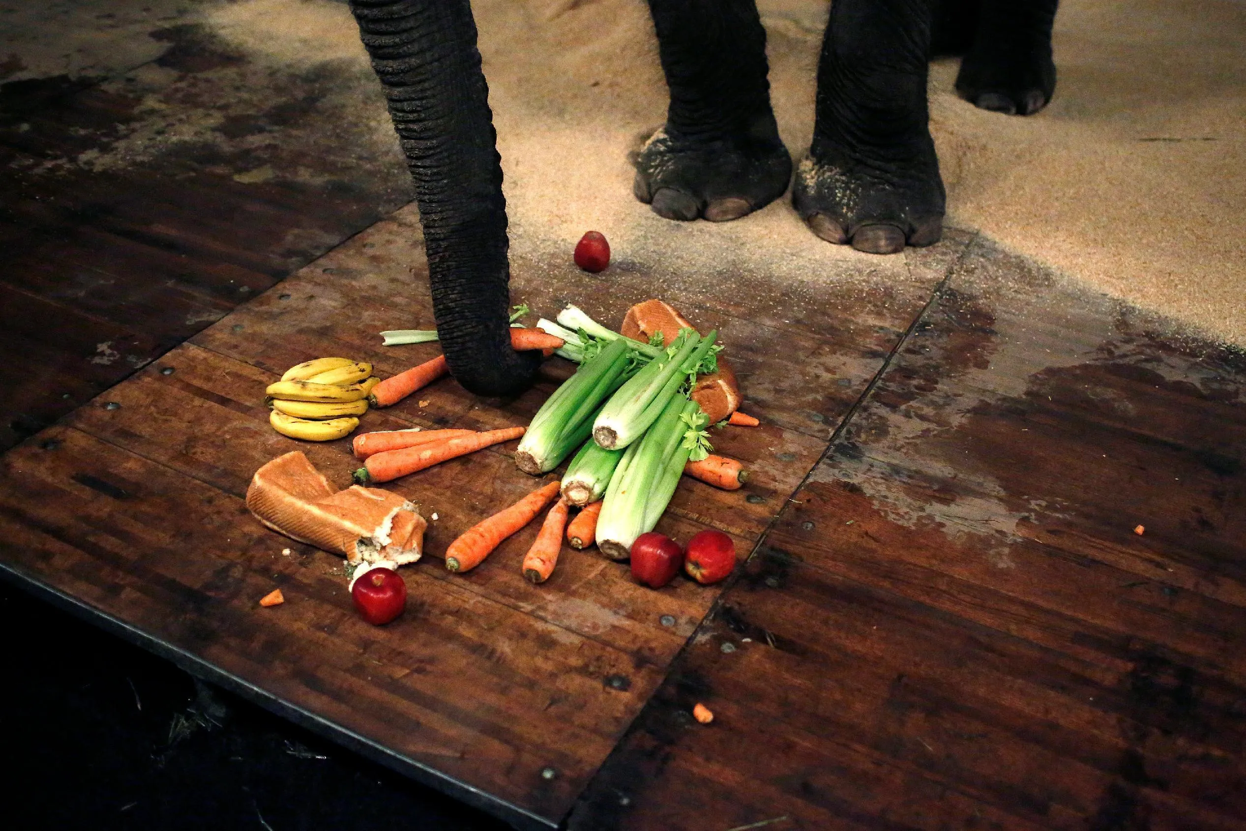An elephant eats a snack after performing at Ringling Bros and Barnum & Bailey Circus' “Circus Extreme” show at the Mohegan Sun Arena at Casey Plaza in Wilkes-Barre, Pennsylvania, U.S., April 29, 2016. (Photo by Andrew Kelly/Reuters)