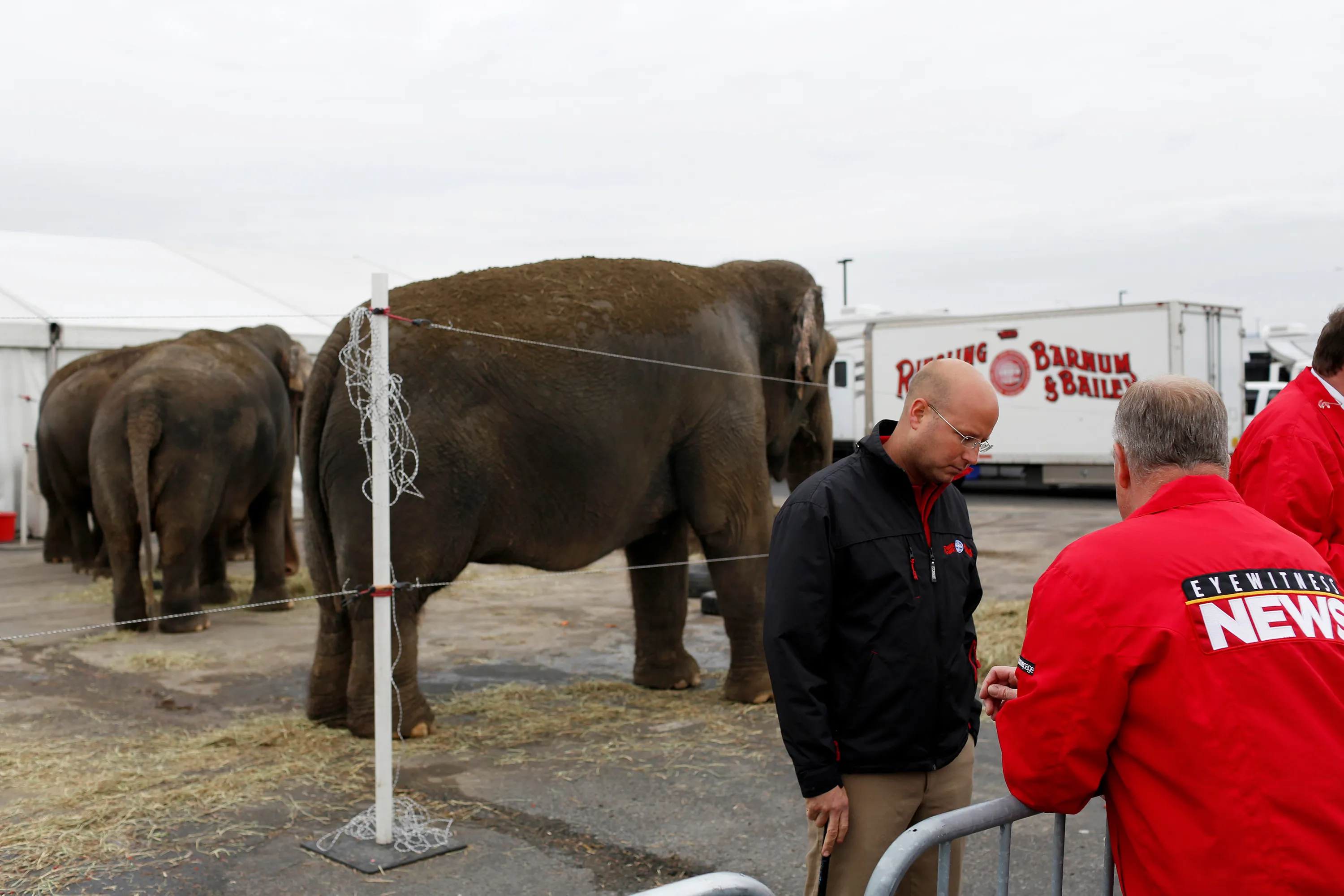 Senior Elephant Handler Ryan Henning speaks to media before Ringling Bros and Barnum & Bailey Circus' “Circus Extreme” show at the Mohegan Sun Arena at Casey Plaza in Wilkes-Barre, Pennsylvania, U.S., April 29, 2016. (Photo by Andrew Kelly/Reuters)