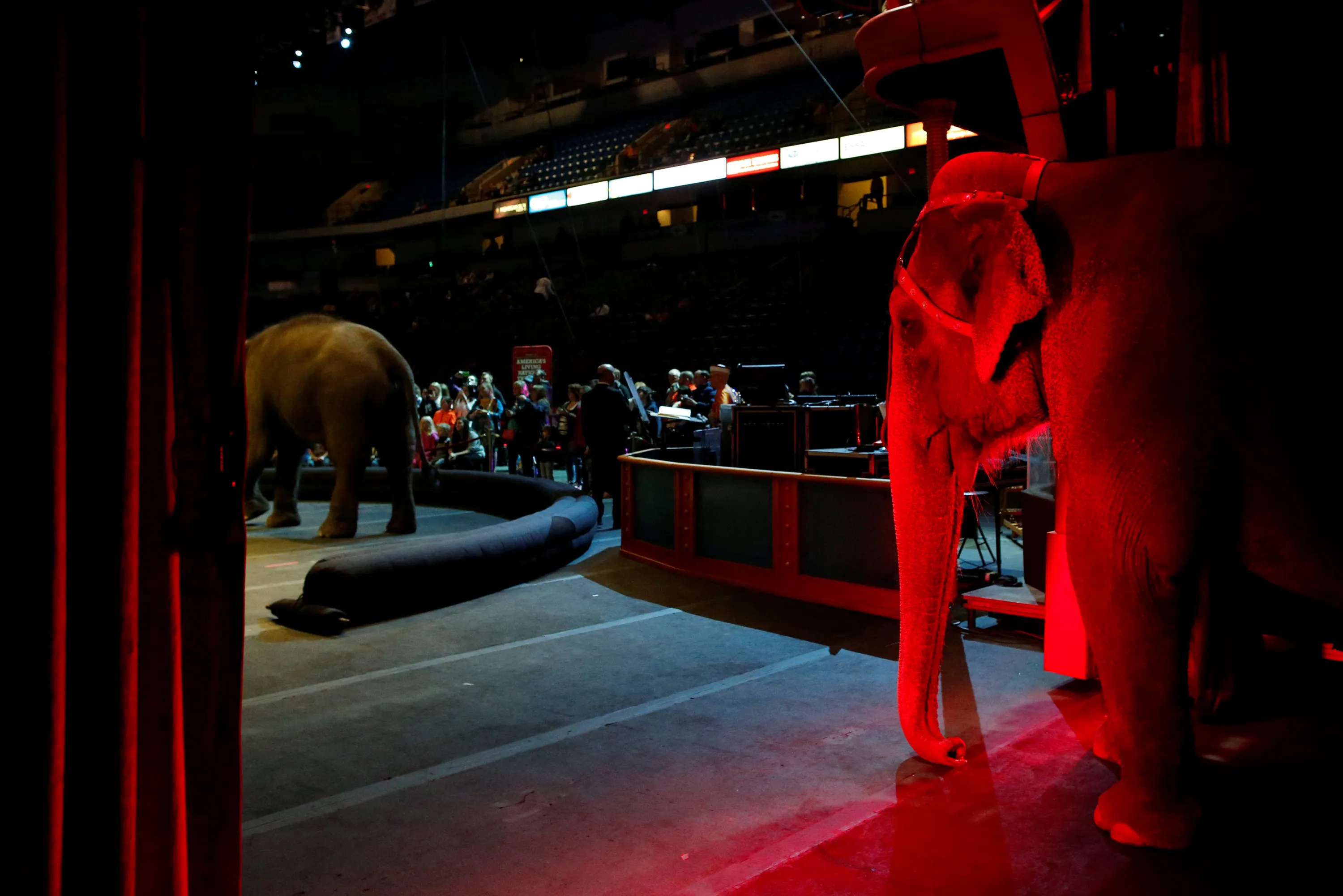 An elephant stands in the entrance of the arena during pre-show entertainment at Ringling Bros and Barnum & Bailey Circus' “Circus Extreme” show at the Mohegan Sun Arena at Casey Plaza in Wilkes-Barre, Pennsylvania, U.S., April 29, 2016. (Photo by Andrew Kelly/Reuters)