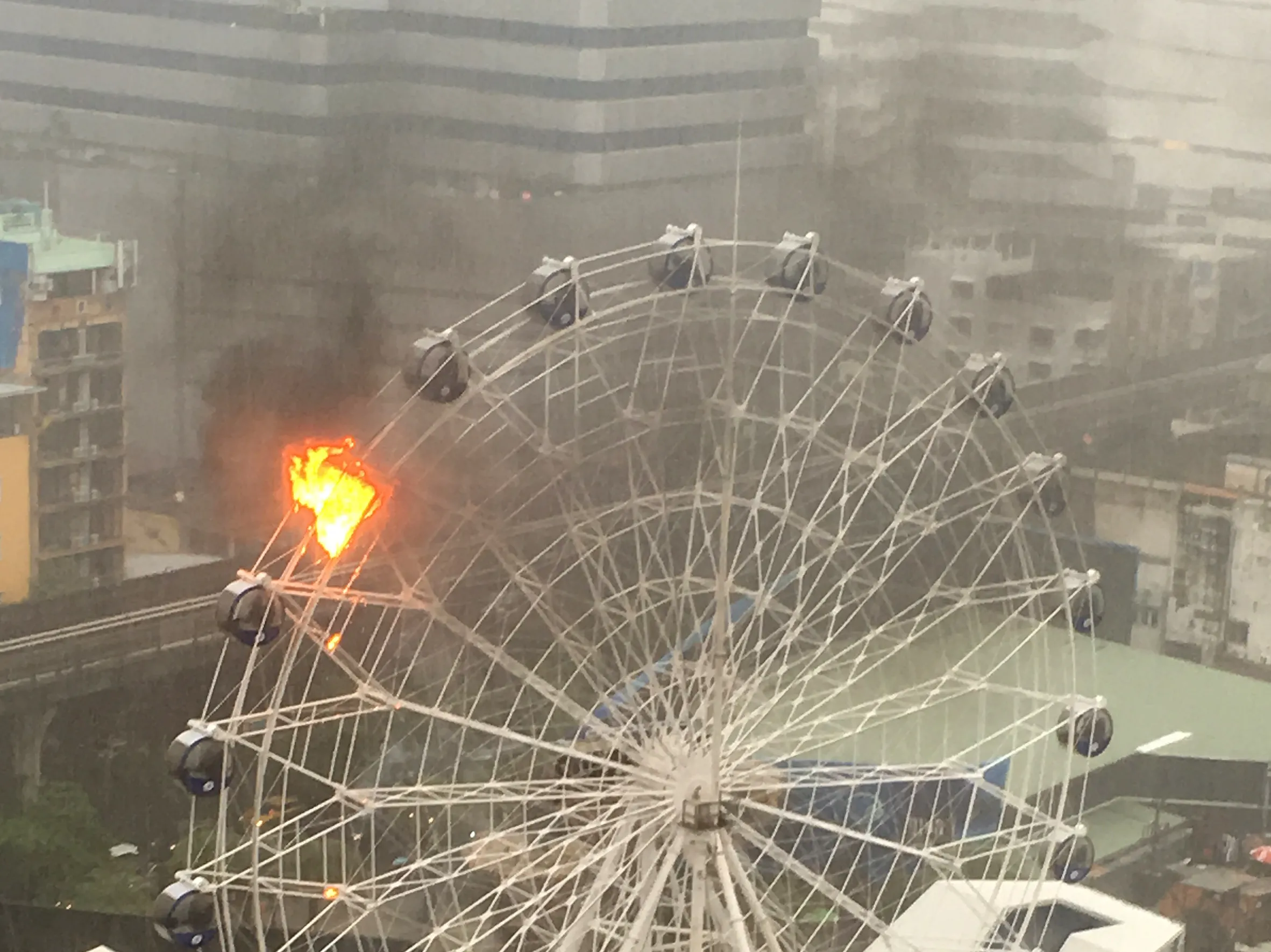 An empty passenger car of a Ferris wheel burns at a newly opened dinosaur theme park in central Bangkok, Thailand, Saturday, April 30, 2016. There were no reports of injuries and the cause of the fire, which was out largely because of a torrential downpour, is not known. (Photo by Shilpa Ko via AP Photo)