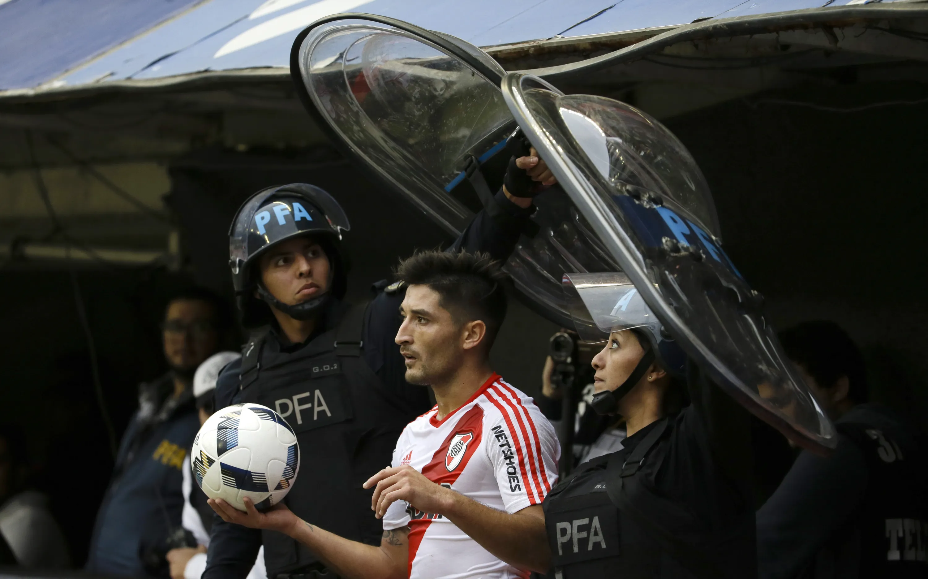 Milton Casco of River Plate is protected by police as he gets ready for a throw-in during a Argentina league soccer match against Boca Juniors in Buenos Aires, Argentina, Sunday, April 24, 2016. (Photo by Natacha Pisarenko/AP Photo)
