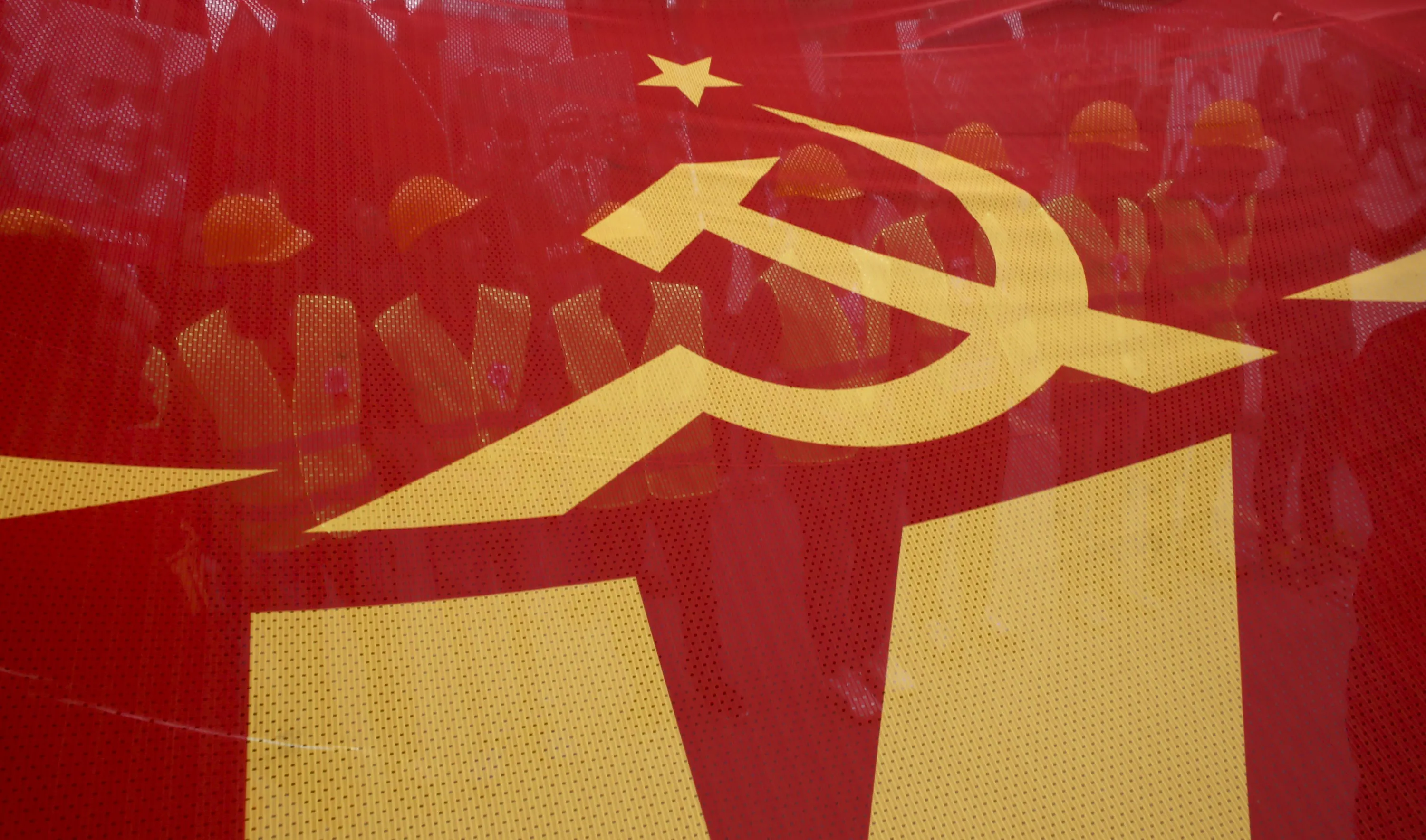 People walk behind a red banner with hammer and sickle symbols during a May Day rally in Istanbul, Turkey, May 1, 2016. (Photo by Murad Sezer/Reuters)