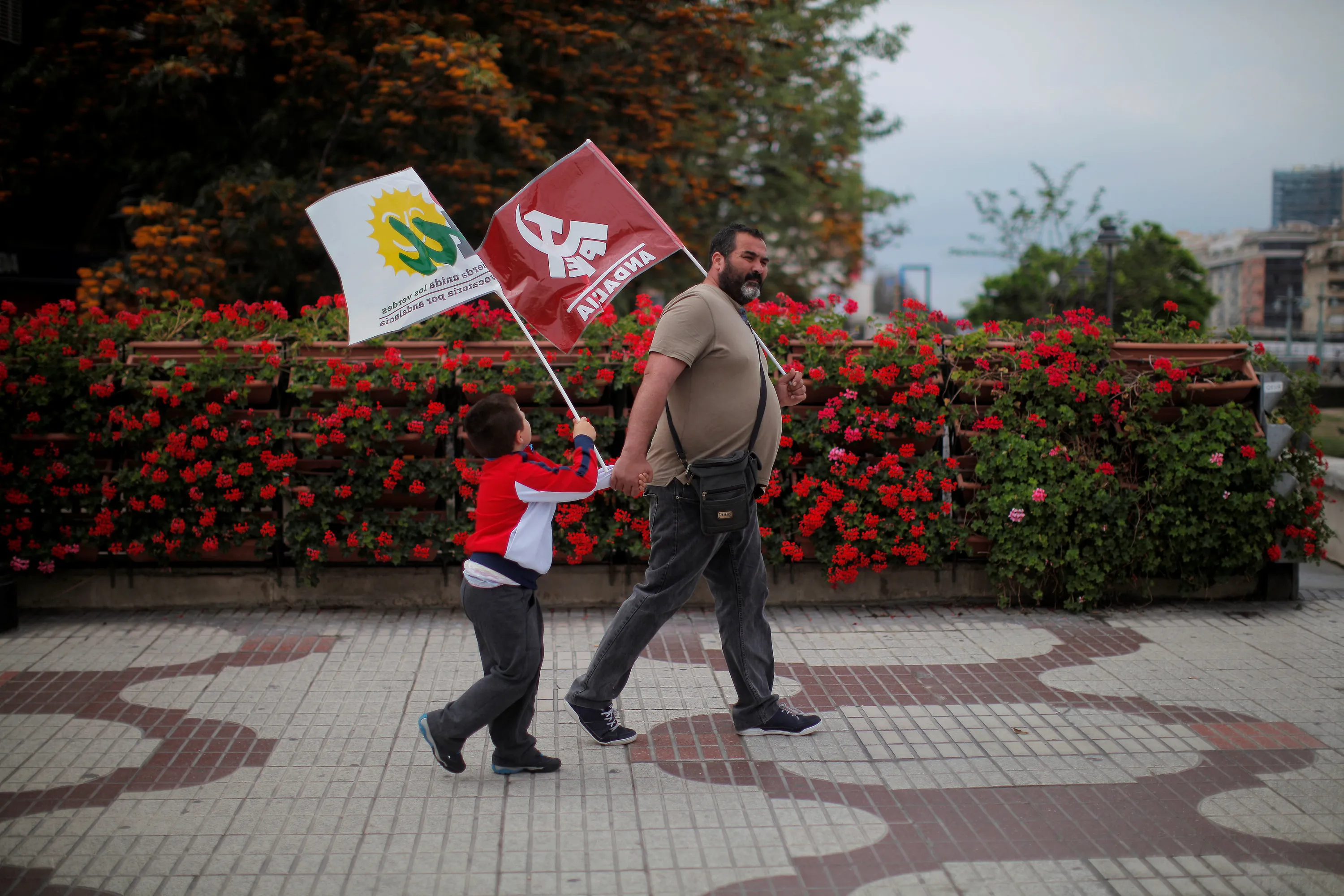 A man and his son carry flags of the Communist party and Izquierda Unida (IU) as they leave a May Day rally in Malaga, Spain, May 1, 2016. (Photo by Jon Nazca/Reuters)