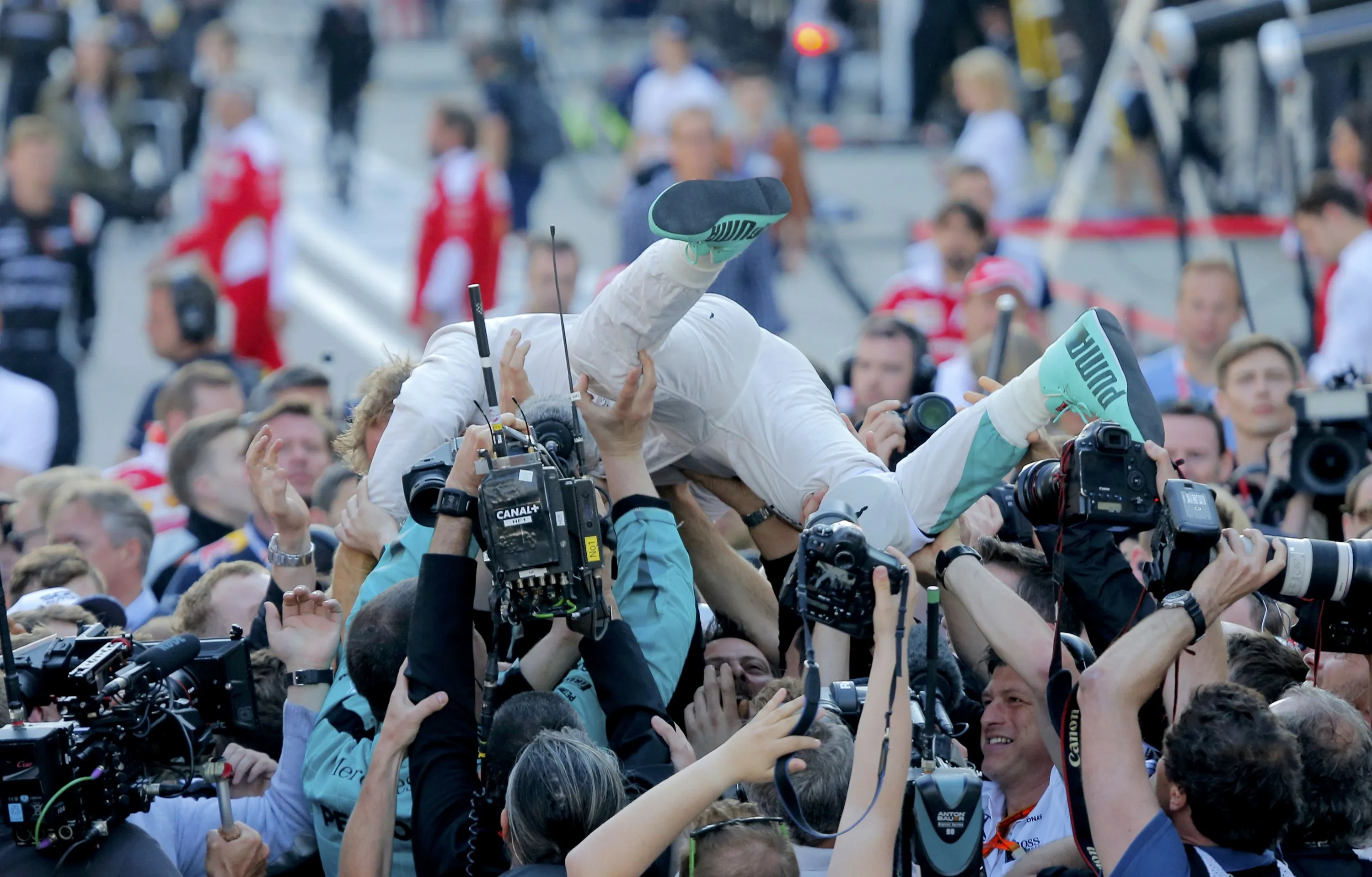 Formula One, Russian Grand Prix, Sochi, Russia on May 1, 2016: Mercedes staff hold on their hands Mercedes F1 driver Nico Rosberg of Germany as they celebrate victory after the Russian Grand Prix. (Photo by Maxim Shemetov/Reuters)