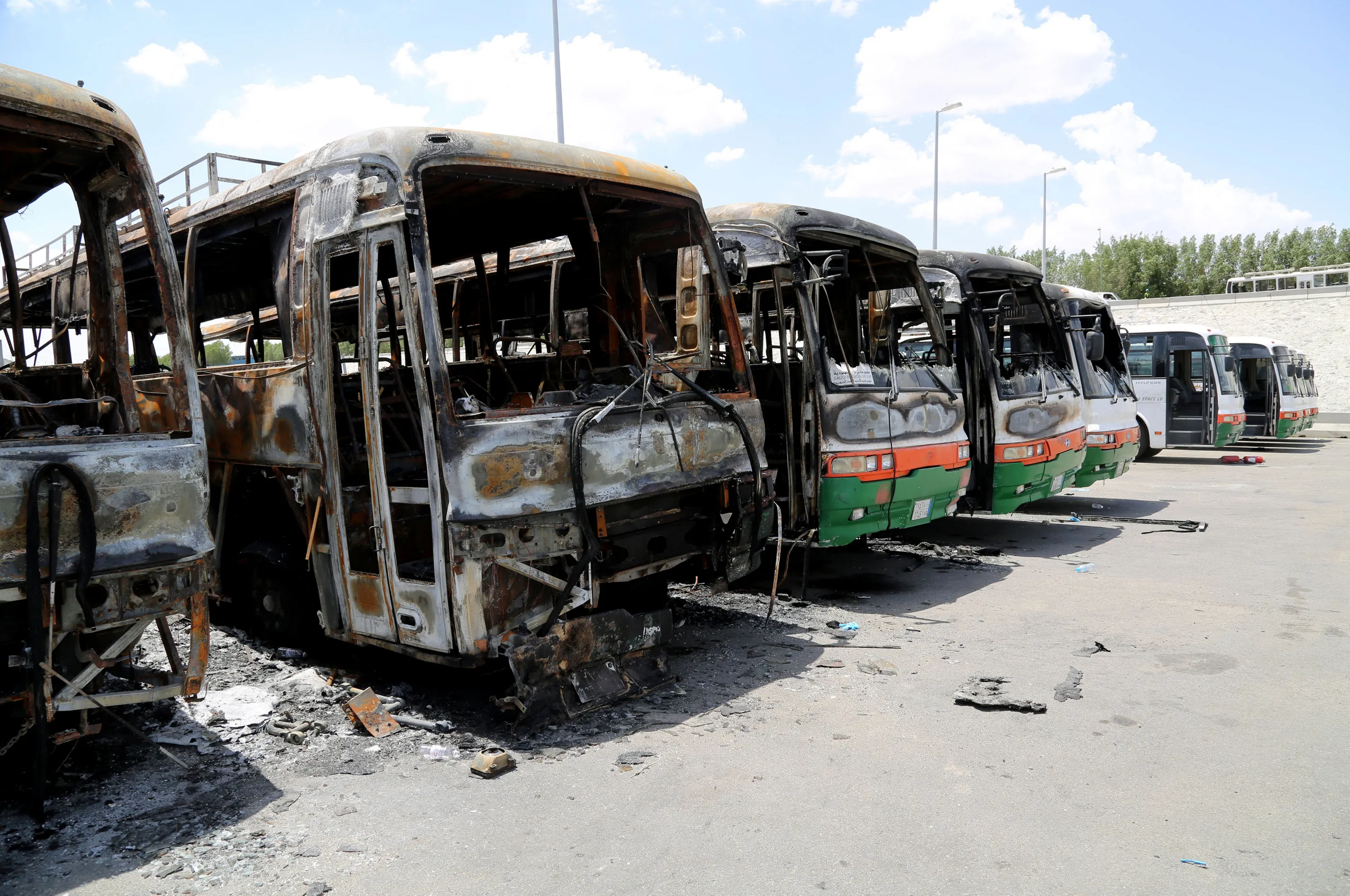 Buses, which witnesses said were burnt by workers from construction company Saudi Binladin Group in a protest over delayed wages, are seen in Mecca, Saudi Arabia May 1, 2016. (Photo by Bandar Al Dandani/Reuters)
