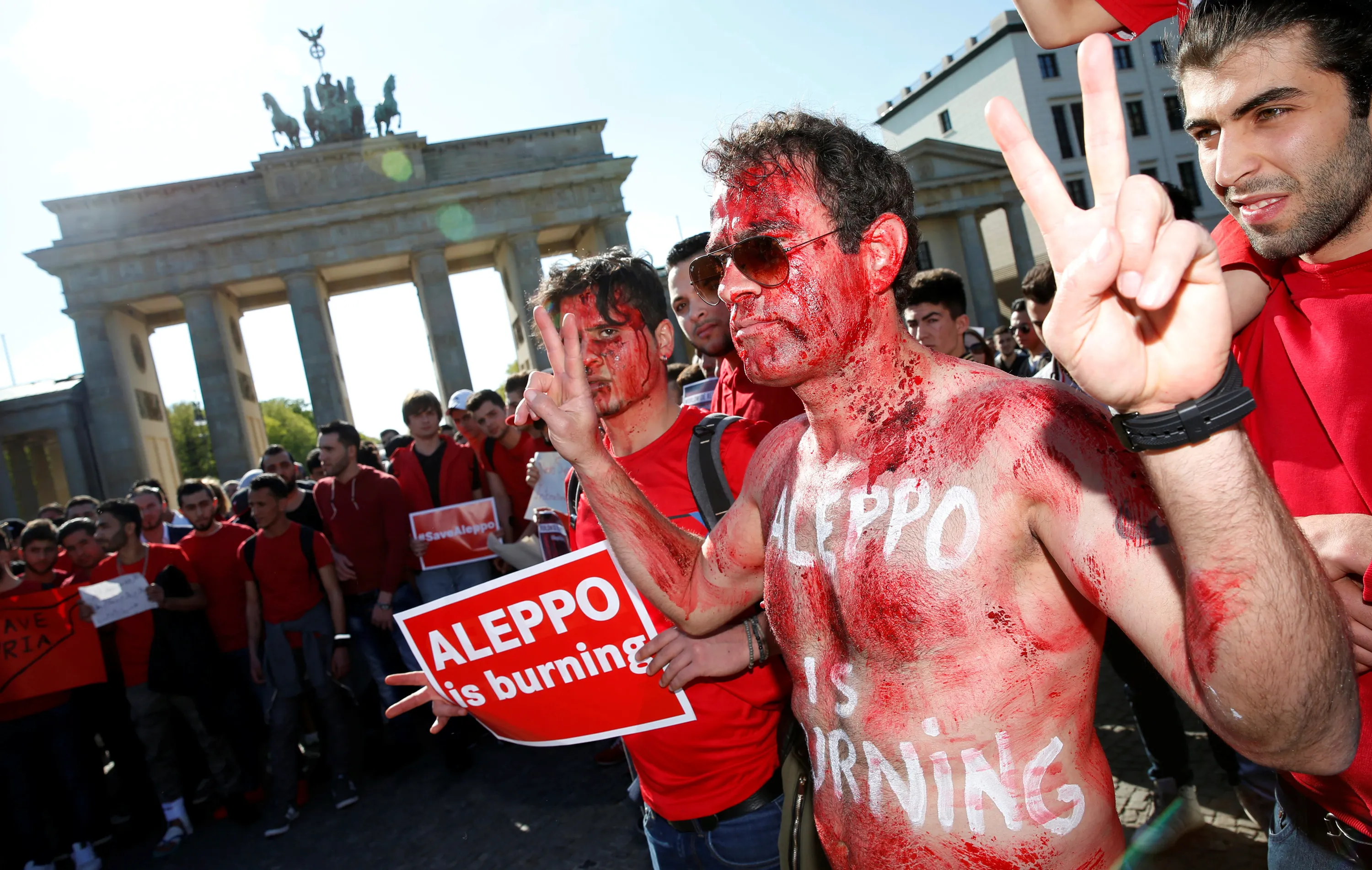 A man with his face and body painted with red colour gestures as they during a rally in solidarity with the people of Aleppo in front of the Brandenburg Gate in Berlin, Germany, May 2, 2016. (Photo by Fabrizio Bensch/Reuters)