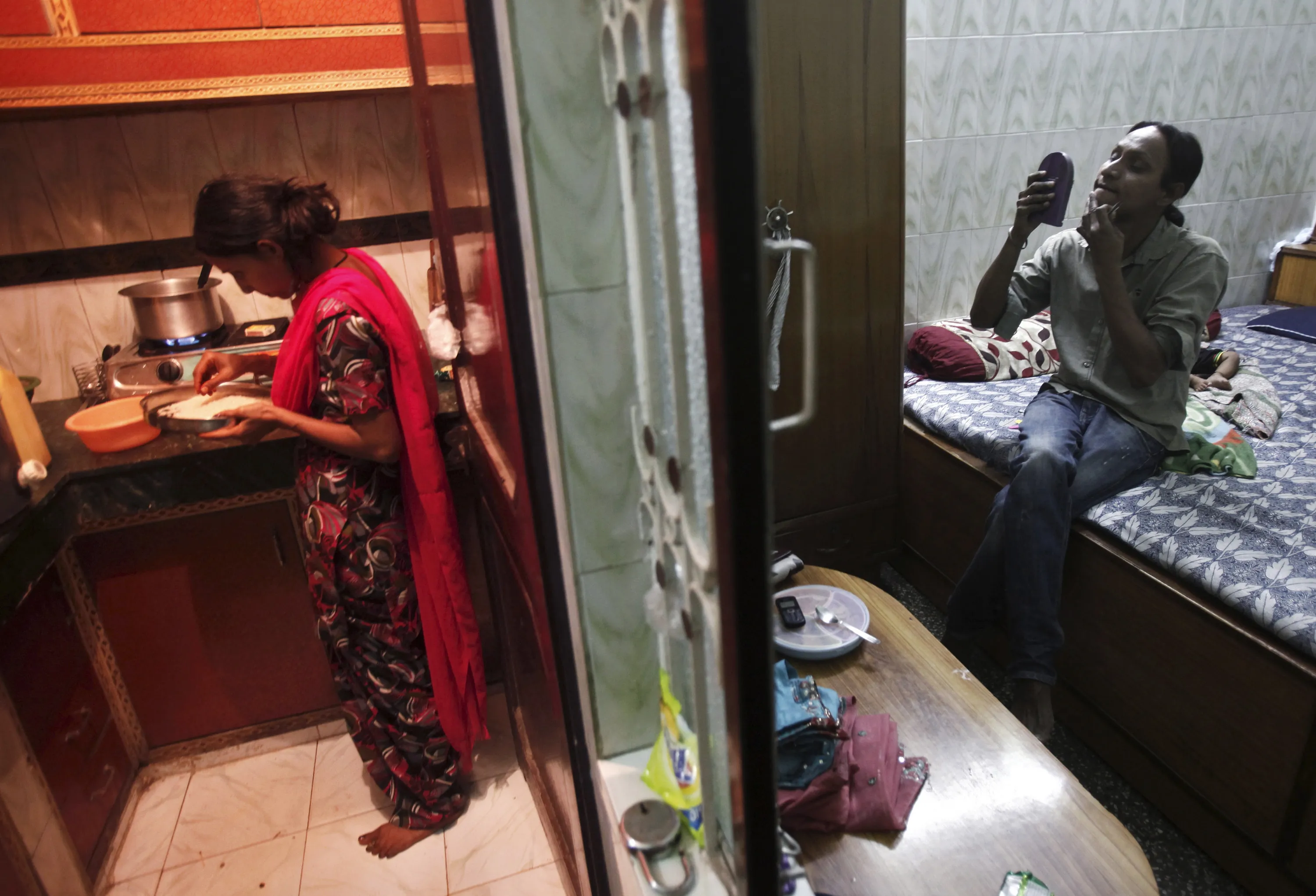 Seema (R), 33, plucks out the stubble from his chin as his wife prepares lunch at their residence in New Delhi May 14, 2012. (Photo by Adnan Abidi/Reuters)