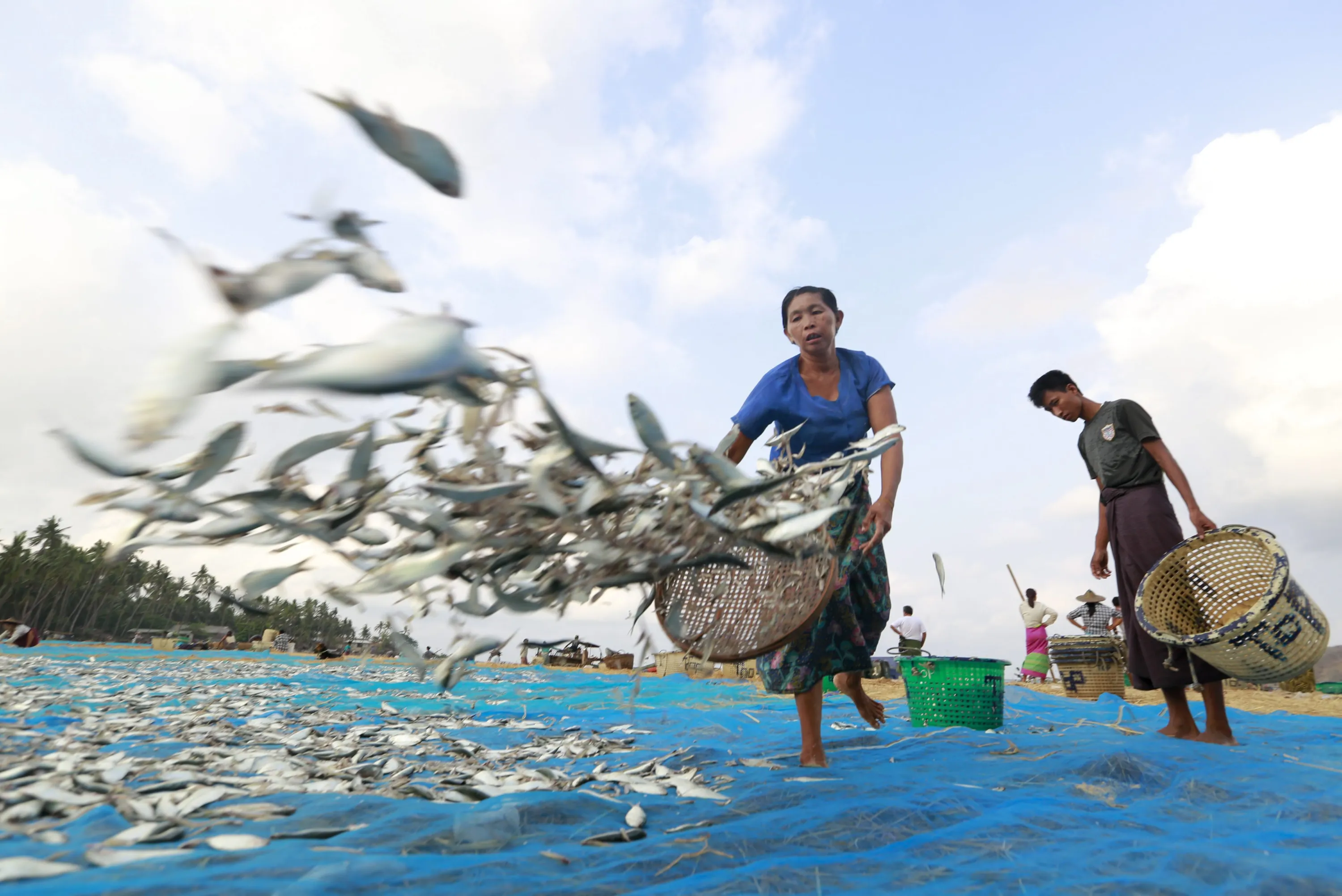A picture made available on 02 May 2016 shows a Burmese woman throwing fish, mostly Tuna, on a cloth for drying, near Ngapali beach, Thandwe township of Rakhine State, western Myanmar, 01 May 2016. Thousands of people from villages around Ngapali beach rely on fishing as their primary income. Over one hundred fishing boats, each holding up to 15 fishermen, go out into the sea in the evening and fish throughout the night. Every morning, when the boats return with their catch, the beach is filled with people carrying baskets, sorting and preparing fish for drying. Most of the fish is dried as the region is too remote to transport fresh fish to major cities. (Photo by Lynn Bo Bo/EPA)