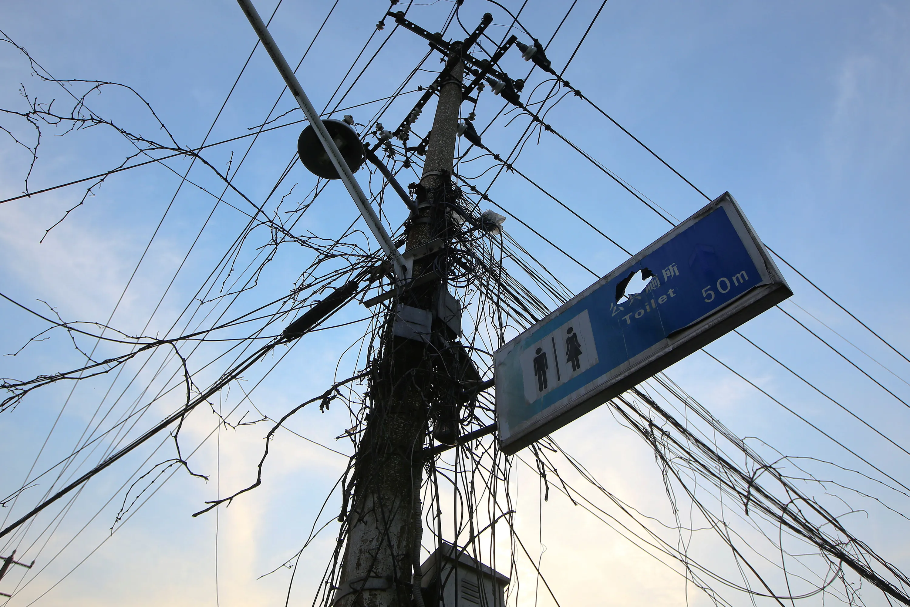 A sign board for a public toilet is seen attached to an electric pole in Guangfuli neighbourhood in Shanghai, China, March 28, 2016. (Photo by Aly Song/Reuters)