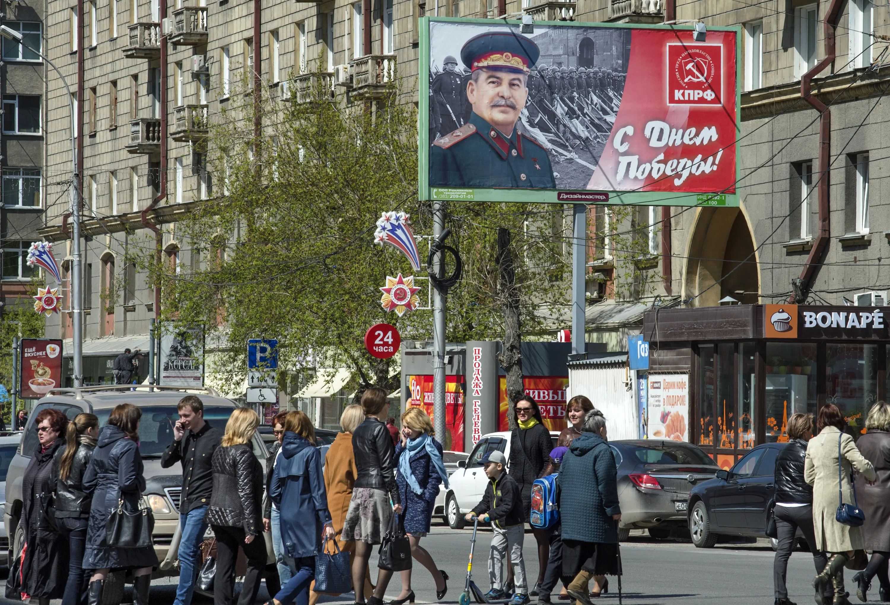 People walk past the poster with WWII Soviet dictator Josef Stalin which was sponsored by local branch of the Communist Party celebrating Victory Day in Novosibirsk, Russia, Thursday, May 5, 2016, about 2800 kms (1,750 miles) east of Moscow. Russia celebrates victory in WWII on May 9. Scholars estimate that under Stalin more than 1 million people were executed in political purges. Millions more died in the vast prison camp system or as a result of mass starvation and deportations. But an increasing number of Russians now admire Stalin as a strong leader who led their country to victory and stood up to the West. (Photo by Ilnar Salakhiev/AP Photo)