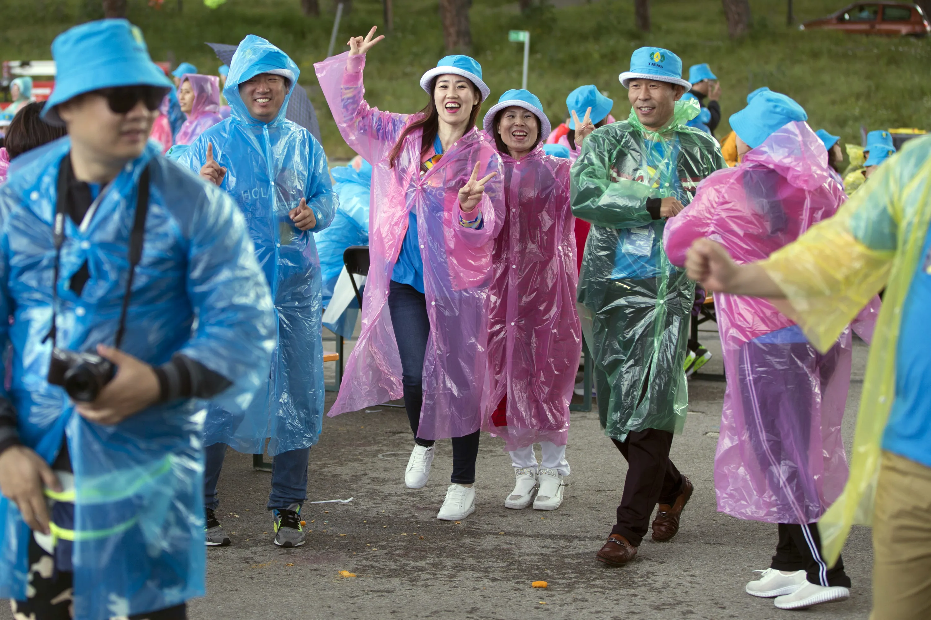 Chinese conglomerate Tiens Group employees dance while waiting to eat Paella in Madrid, Spain, Friday, May 6, 2016. (Photo by Paul White/AP Photo)