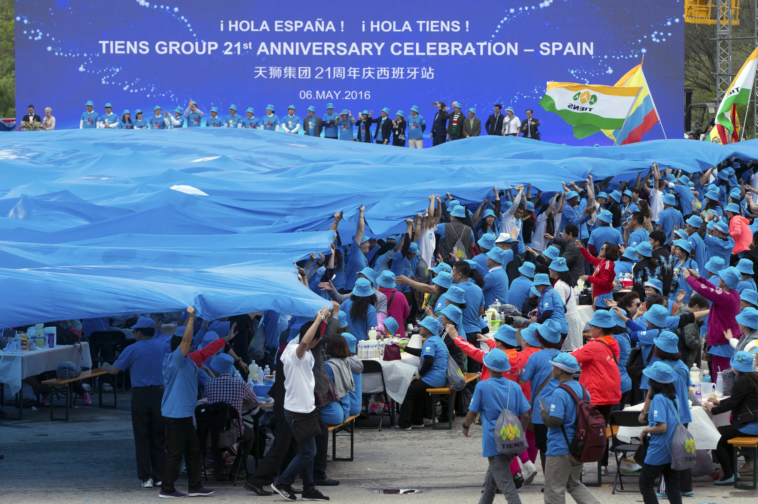 Chinese conglomerate Tiens Group employees unfurl a giant banner during a celebration in Madrid, Spain, Friday, May 6, 2016. (Photo by Paul White/AP Photo)