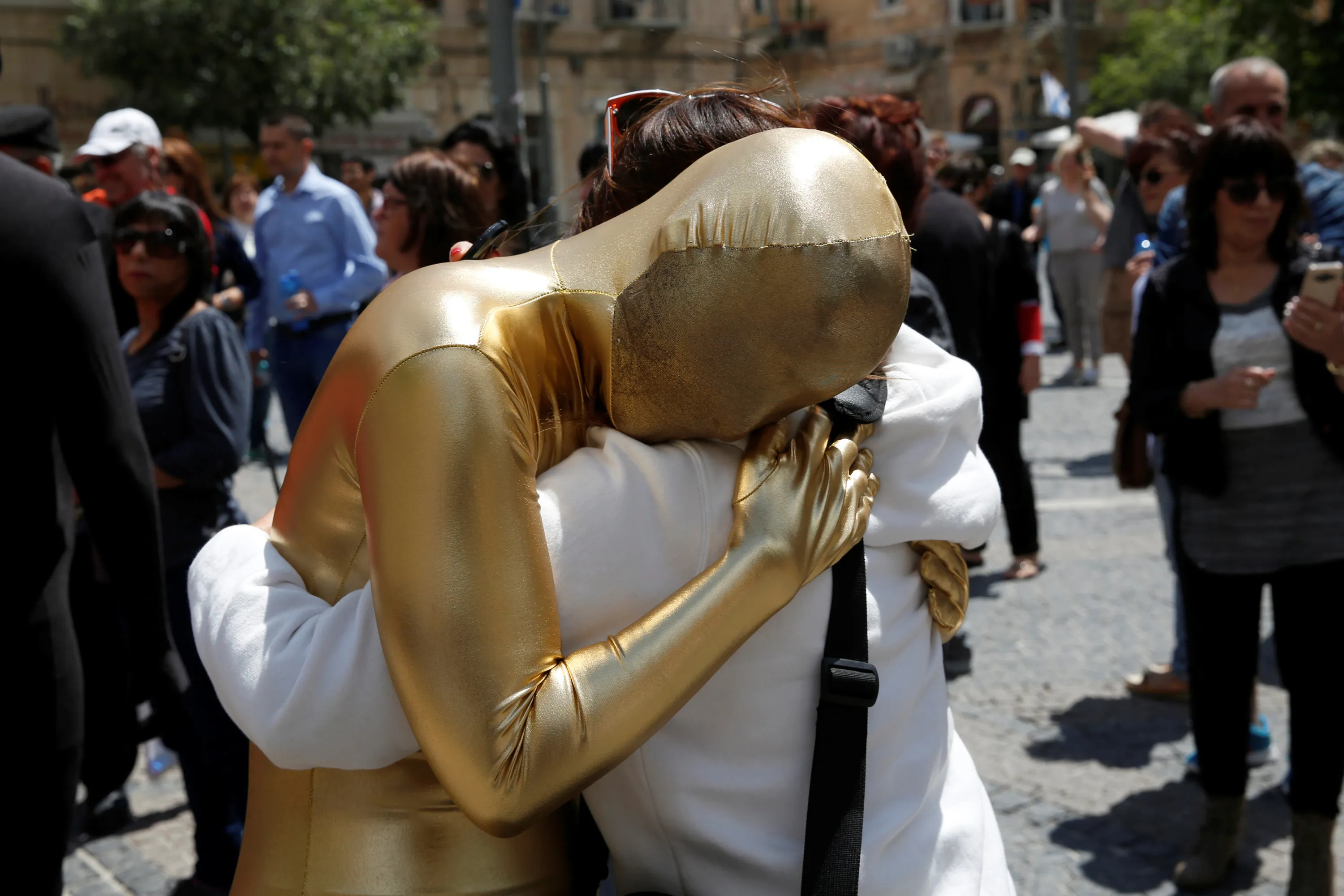 A member of the Prizma Ensemble wearing a full solid-coloured bodysuit hugs a bystander as she takes part in the 6th Jane's Walk Jerusalem in Jerusalem May 6, 2016. (Photo by Baz Ratner/Reuters)