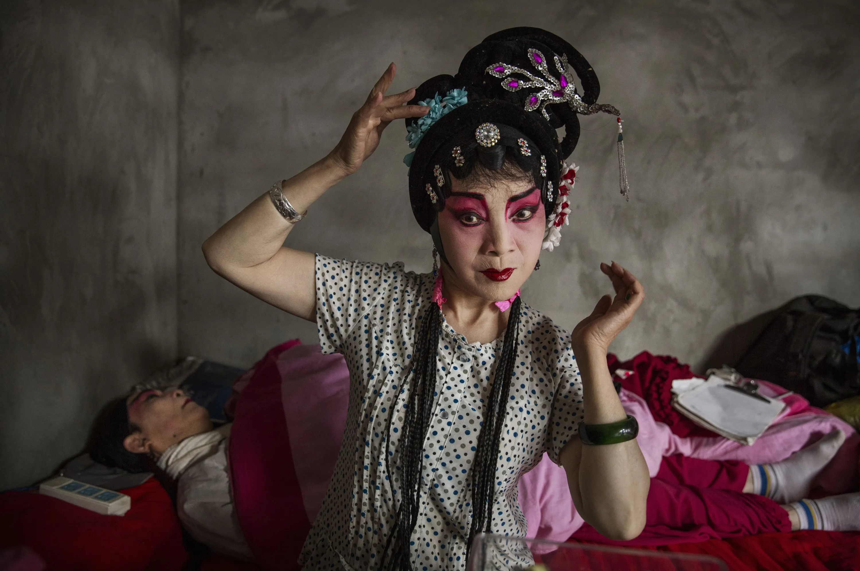 Sichuan Opera performer Lin Lijuan, 69 years, of the Jinyuan Opera Company prepares before the group's performance for villagers at the Dongyue Temple on May 2, 2016 in Cangshan, Sichuan province, China. (Photo by Kevin Frayer/Getty Images)